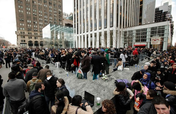 Chỉ có vài sự khác biệt đáng kể giữa iPad mới và iPad 2, nhưng điều này không làm ngừng hàng ngàn người hâm mộ iPad xếp hàng dài để là người đầu tiên mua được iPad mới vào sáng thứ sáu vừa qua. Ở New York, dòng người trước cửa hàng Apple ở đại lộ thứ 5 đã xếp hàng dài tới tận một khối phố và những người hâm mộ đã chật cứng nhiều hành lang ở cửa hàng Trung tâm lớn mới.