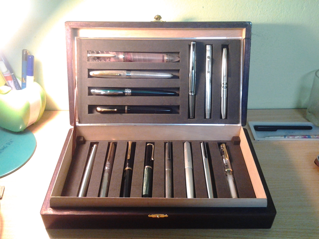 Xin cháo các anh chị,em thì chỉ mới gia nhập chừng vài tháng nay thôi, nên cũng là chiếc hộp đầu tiên của em, em có vài người quen chuyên làm hộp gỗ, họ cũng chẳng bao giờ làm hộp bao giờ, đây sản phẩm đầu tiên của họ làm cho em, vì là sản phẩm đầu tiên nên cũng có chút sai xót, có gì mọi người bỏ qua cho,với tổng thiệt hại hơn 400 nghìn một chút, em đã có được một hộp bút với 2 ngăn, mỗi ngăn là 8 cây, là quá nhiều so với tài sản bút còn èo ọt của em, em xin chia sẻ cùng mọi người ạ. Thân Chào mọi người.
