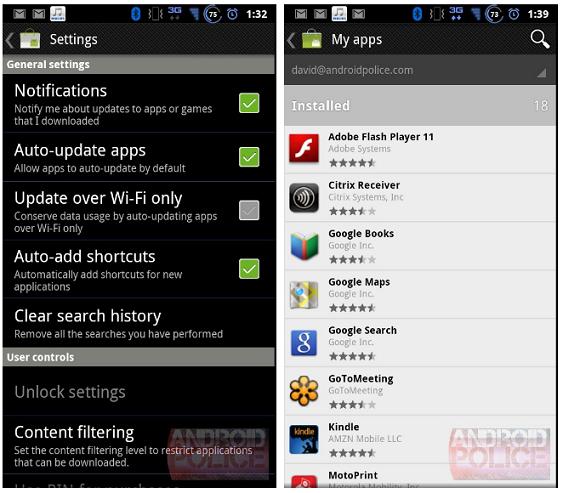Một trong những điểm hấp dẫn nhất của đợt cập nhật này là ứng dụng (trên Market) sẽ được cập nhật như thế nào. Nếu như bạn là người không quan tâm đến vấn đề cập nhật cho ứng dụng (đã cài) lắm thì với phiên bản cập nhật lần này chúng ta có thể dễ dàng cho "tháo gỡ" tính năng cập nhật ứng dụng đã cài một cách dễ dàng và chúng ta có thể để mặc định rằng nếu ứng dụng được nâng cấp thì sẽ chỉ được thực hiện qua giao thức Wi-fi, và do vậy chúng ta sẽ có hể tiết giảm được chi phí kết nối mạng. Phiên bản cập nhật mới cũng cho phép chúng ta cài đặt để hiệu chỉnh tất cả những ứng dụng đã cài chuyển sang chế độ cập nhật tự động, trường hợp này được áp dụng khi trước đó có một vài ứng dụng mà chúng ta cài cho nó ở chế độ cập nhật thủ công thì nay lại muốn chuyển hết sang tự động chỉ bằng một thao tác đơn giản.