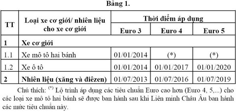 Theo dự thảo Quyết định phê duyệt lộ trình áp dụng tiêu chuẩn khí thải Châu Âu đối với phương tiện giao thông cơ giới đường bộ sản xuất, lắp ráp và nhập khẩu mới đang được Bộ Giao thông Vận tải xây dựng trình Thủ tướng Chính phủ ban hành, ngày 1/1/2017 và ngày 1/1/2020 sẽ lần lượt áp dụng tiêu chuẩn khí thải Euro 4 và Euro 5 cho ôtô; đồng thời áp dụng tiêu chuẩn tương tự với nhiên liệu trước các thời điểm nêu trên 6 tháng.
