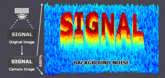 Nhiễu ảnh luôn luôn xuất hiện theo nhiều mức độ khác nhau ở các thiết bị điện tử truyền tải và nhận tín hiệu. Với tivi tín hiệu này là dữ liệu truyền hình được truyền tải thông qua cáp hoặc nhận nhờ antenna; với máy ảnh số, tín hiệu này là ánh sáng tới cảm biến máy ảnh. Mặc dù không tránh được nhiễu ảnh nhưng nhiễu ảnh có thể nhỏ tới mức dường như không tồn tại. Tỉ lệ tín hiệu nhiễu (SNR - Signal to Noise Ratio) là cách phổ biến để so sánh tương quan giữa tín hiệu và nhiễu ảnh cho bất kì hệ thống điện tử nào; tỉ số cao sẽ ít bị nhiễu ảnh còn ngược lại thì sẽ nhiều nhiễu ảnh. Chuỗi hình ảnh dưới cho thấy hình cực nhiễu trên nền mượt. Ngoài ra còn có hình ảnh 3-D phóng lớn mô tả tín hiệu phía trên nền nhiễu. Hình ảnh trên có SNR cao tách thông tin hình ảnh khỏi nhiễu nền. SNR thấp sẽ tạo hình ảnh có tín hiệu và nhiễu ảnh ngang nhau nên khó phân biệt hai thứ.Thuật ngữ