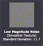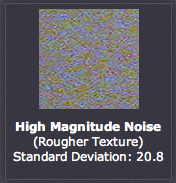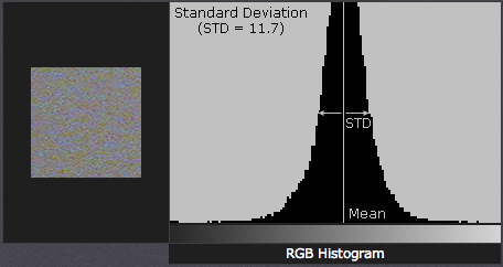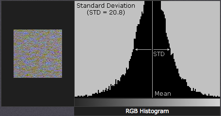 Lưu ý làm thế nào mà mẫu bên trái lại mượt hơn mẫu bên phải. Cường độ nhiễu cao hơn có thể lại tốt hơn, ví dụ như vải hoạc lá, có thể rất khó khăn để loại bỏ mà không làm mềm ảnh. Cượng độ nhiễu thường được mô tả dựa trên cách thống kê gọi là "độ lệch tiêu chuẩn" (standard deviation), định lượng sự thay đổi của một điểm ảnh so với giá trị chuẩn. Khái niệm này cũng có thể được hiểu bằng cách xem biểu đồ histogram sau: