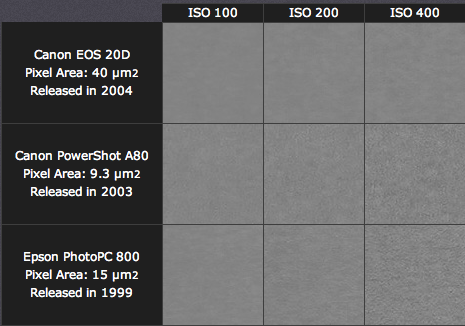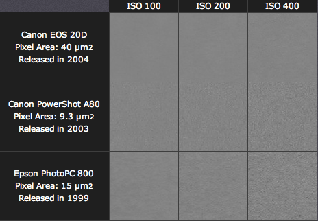 Bạn có thể tăng tốc độ ISO để sinh nhiễu nhiều hơn, tuy nhiên nhiễu giữa các máy càng phức tạp hơn. Diện tích của mỗi điểm ảnh trên cảm biến càng lớn thì lượng sáng càng nhiều, do đó nhận tín hiệu tốt mạnh hơn. Và kết quả là các máy ảnh có diện tích vật lý của điểm lớn hơn sẽ sinh ít nhiễu hơn. Đây là lý do tại sao máy ảnh có khả năng ghi ảnh có kích thước MegaPixel lớn hơn nhưng trên cùng diện tích cảm biến không tạo được hình ảnh tốt hơn. Mặt khác, một tín hiệu mạnh không nhất thiết dẫn đến nhiễu ít hơn do tính tương đối giữa tín hiệu và nhiễu. Mặc dù Epson PhotoPC 800 có nhiều điểm ảnh hơn Canon PowerShot A80, nhưng hình ảnh lại nhiễu hơn, đặc biệt ở ISO 400. Đó là vì chiếc máy ảnh cũ Epson sẽ có nhiễu cao hơn do đặc tính thiết bị điện tử.