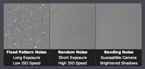 Máy ảnh số sản sinh ra 3 loại nhiễu chính: nhiễu ngẫu nhiên - random noise, nhiễu mẫu cố định - fixed pattern noise, và nhiễu theo dải - banding noise. Ba ví dụ dưới đây minh hoạ cho 3 loại nhiễu trên nền xám.
