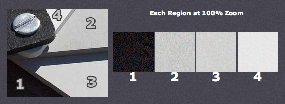 Sẽ rất hữu ích để thử nghiệm máy ảnh của bạn sinh nhiễu như thế nào khi đặt các chế độ ISO khác nhau. Ví dụ sau đây cho thấy các đặc điểm của nhiễu khác nhau trên 3 máy ảnh khác nhau đối với mẫu mà một mảnh màu xám.