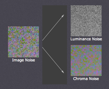 Nhiễu cũng được tạo ra từ hai thành phần khác: màu sắc và độ sáng. Nhiễu do màu sắc hoặc sắc độ thường không tự nhiện xuất hiện và có thể làm cho hình ảnh không dùng được khi không kiểm soát được. Ví dụ sau đây cho thấy nhiễu từ màu sắc (sắc độ) và độ sáng như thế nào.Sự ảnh hưởng của sắc độ và độ sáng đối với từng dòng máy ảnh kỹ thuật số khác nhau là khác nhau. Phần mềm làm giảm nhiễu có thể được dùng để loại bỏ cả nhiễu sắc độ và độ sáng, tuy nhiên nếu loại bỏ hoàn toàn nhiễu độ sáng có thể làm cho hình ảnh mất tự nhiên hoặc nhìn như "plastic".