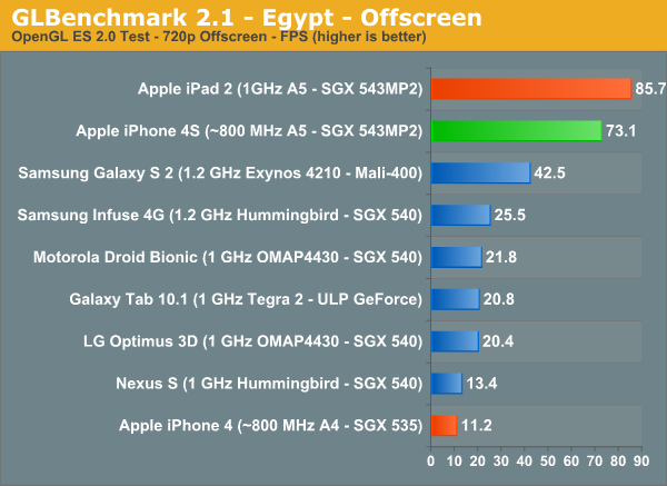 Mặc dù iPhone4S đang tiếp nhận đơn đặt hàng mua trước, nhưng trang công nghệ anandtech.com đã được sử dụng trước một sản phẩm để kiểm tra và đánh giá. Theo báo cáo cuối cùng của anandtech thì tốc độ chip A5 của iPhone4S là 800 MHz, chậm hơn 25% so với iPad2, nhưng gần gấp đôi so với iPhone4.
