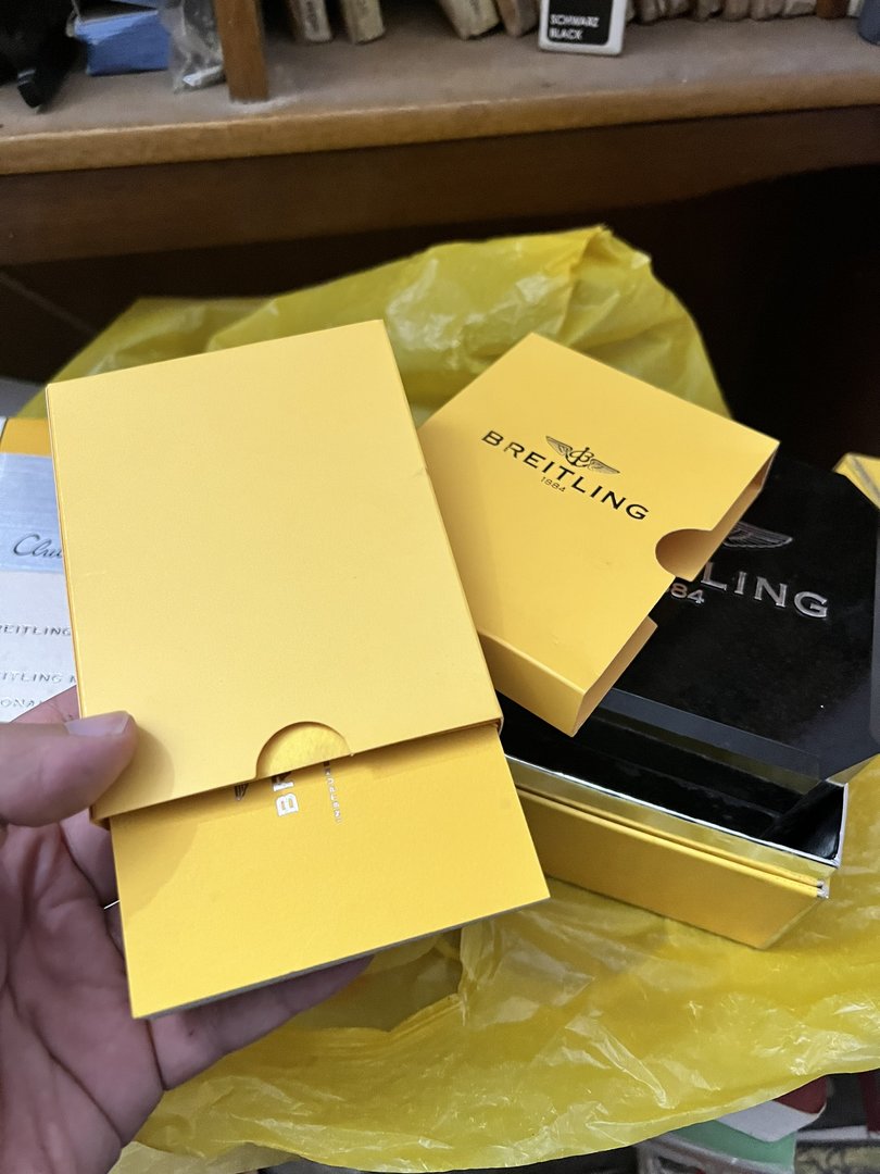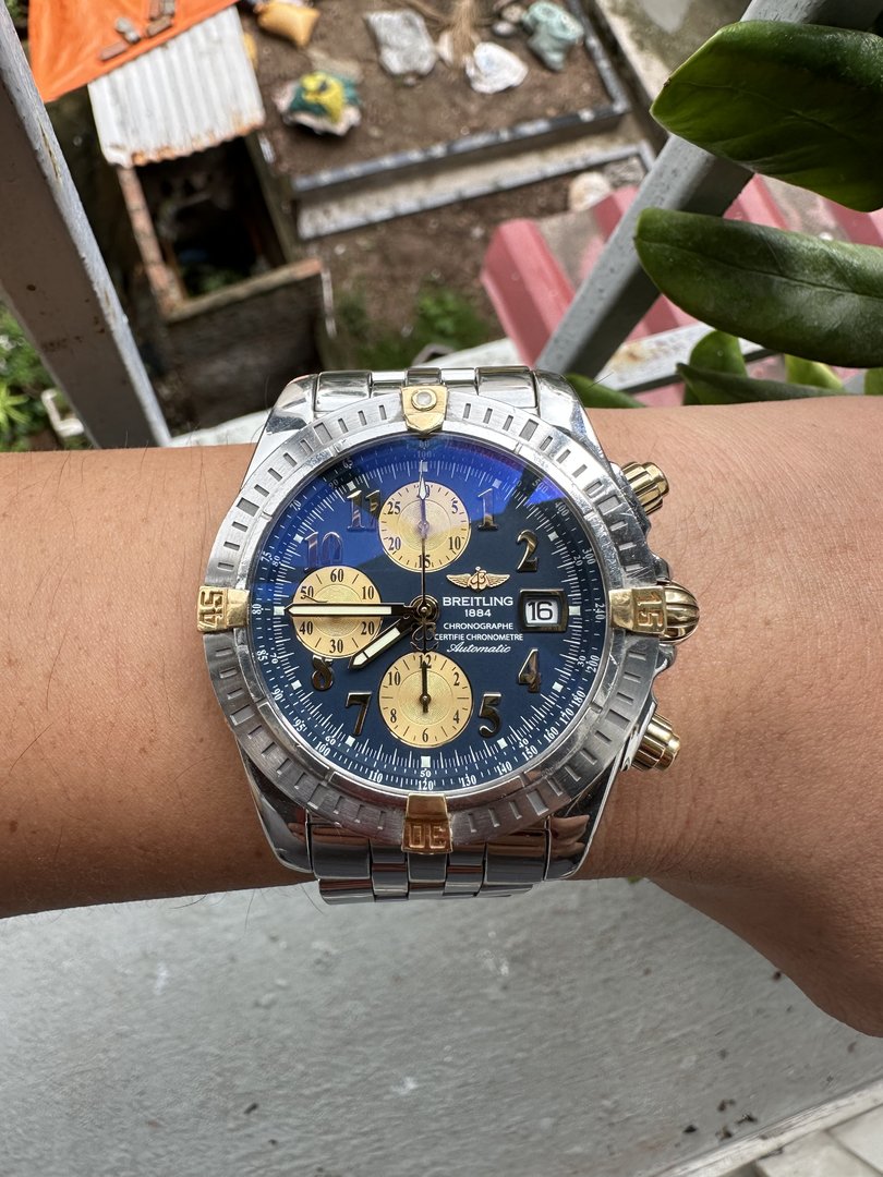 Mình cần bán chiếc Breitling Chronomat B13356 mặt xanh, cọc số học trò hiếm gặp. Chỗ nào màu vàng là vàng đúc. Đồng hồ đủ dây cho tay 20cm. Size tuy 43 nhưng lug to lù chỉ 51mm lên tau giống như size 41 một số hãng ai cổ tay tầm 16.5cn là phì hợp.