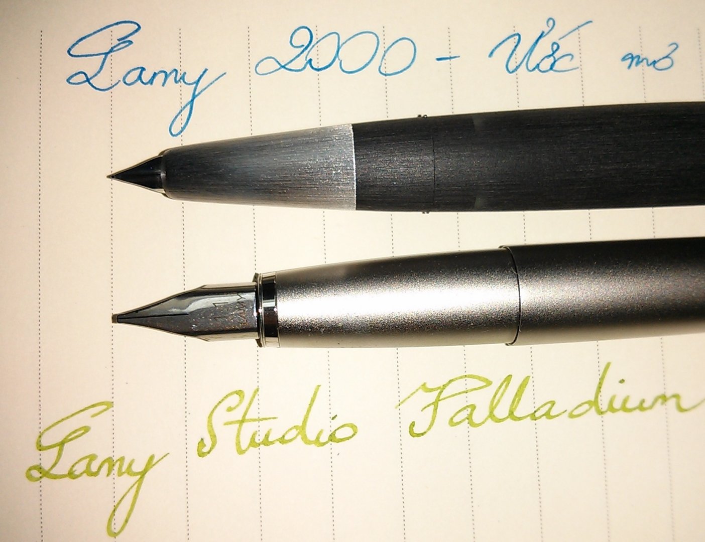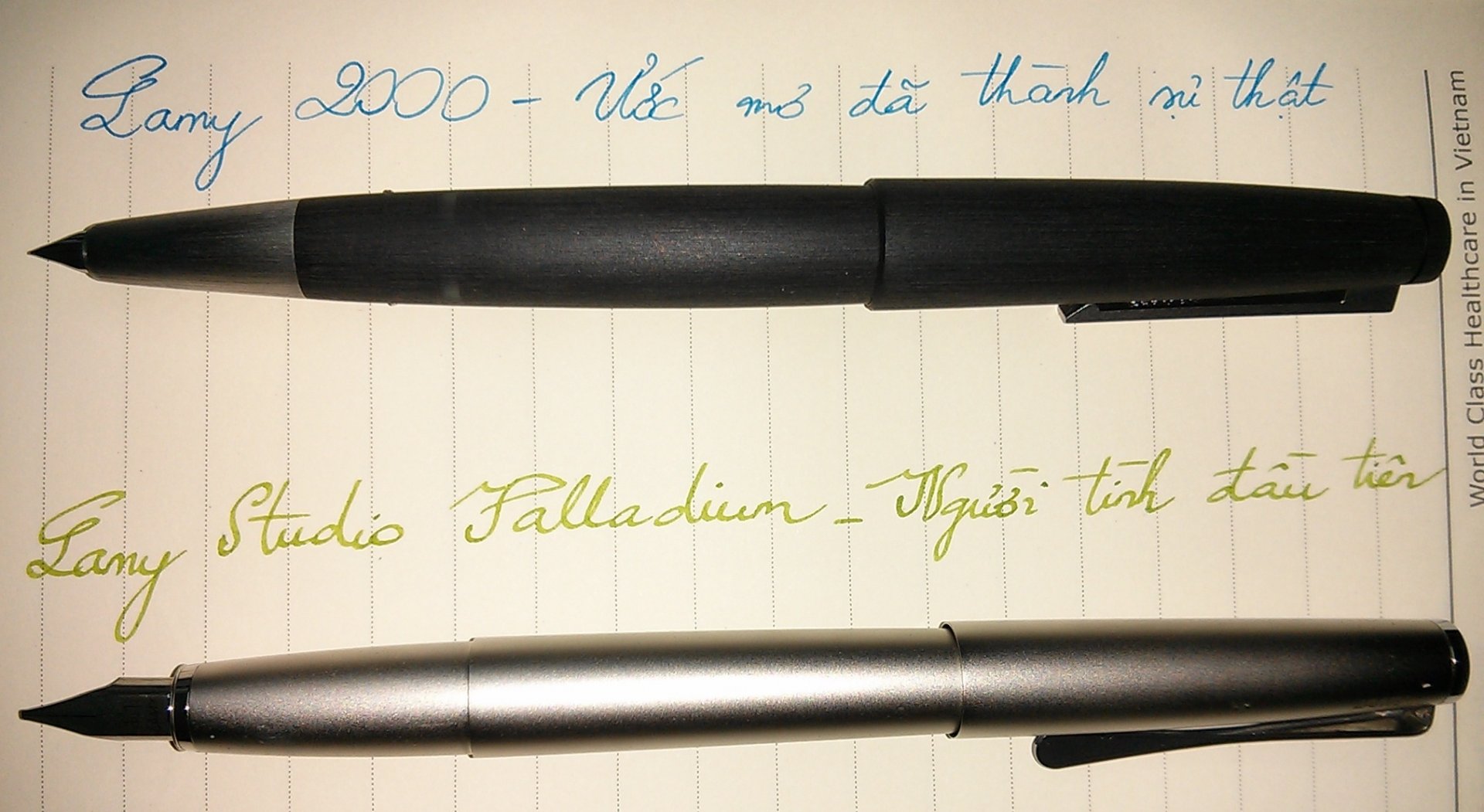Về ngòi Lamy thì mình cũng đã có ngòi thép EF, F, M, 1.5. Ngay cả ngòi thép EF và ngòi EF của em Lamy 2000 cũng đã khác nhau, ngòi EF của em 2000 mảnh và nhỏ hơn rất nhiều. Bây giờ, mình chỉ săn lùng ngòi OM để thử cảm giác viết xem thế nào, còn các loại ngòi to như ngòi B, BB, OB, 1.5, 1.9 thì chịu thua vì to quá không phù hợp với nét chữ nhỏ của mình.