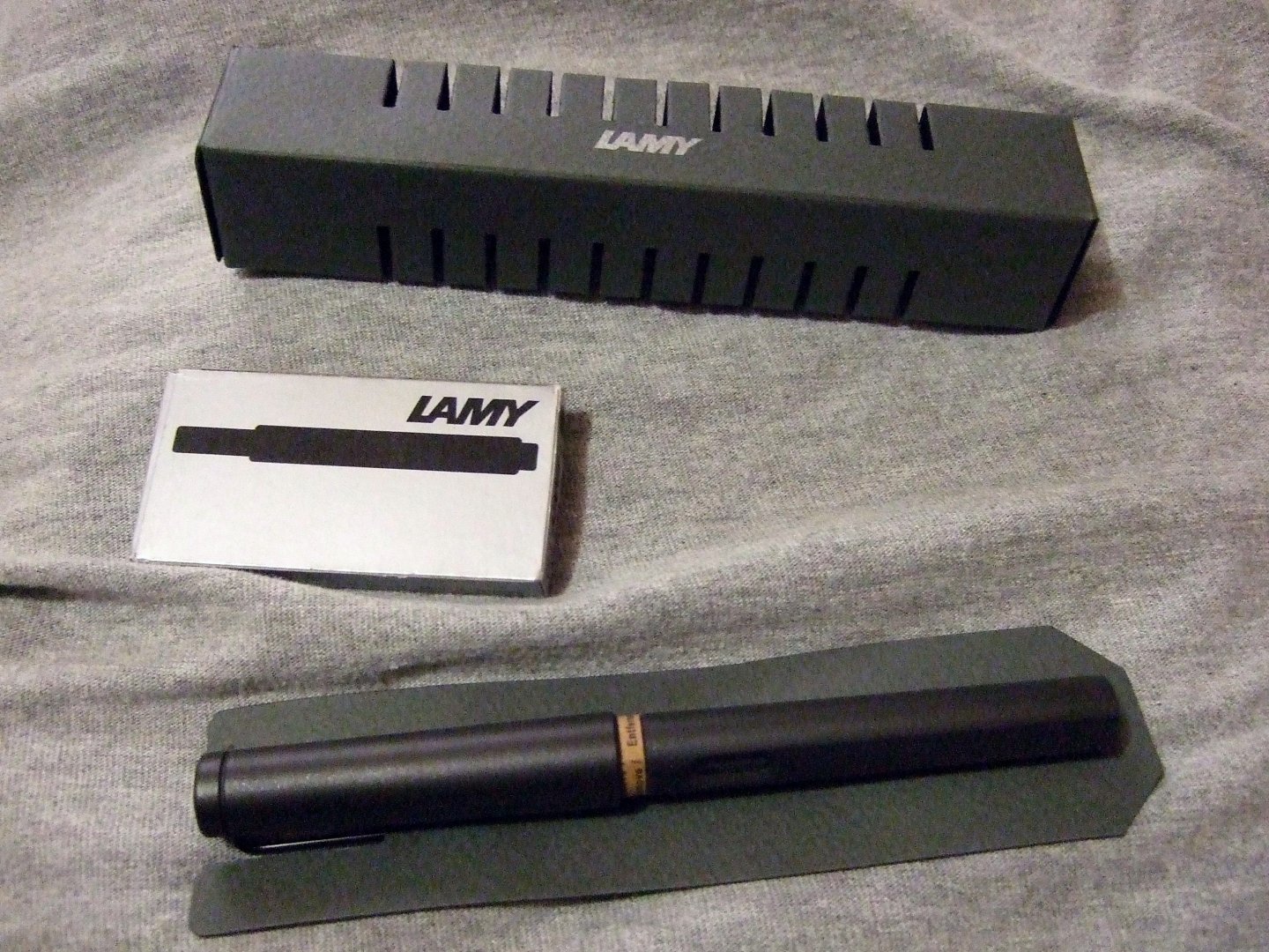 Em mua ở Đức cũng chỉ có nhõn cái hộp giấy màu đen nhưng chả vừa khít bút mà rộng thênh thang luôn :-/ ăn may là mang về hộp hơi bẹp mà bút an toàncác bác mua Lamy có box đẹp nhỉ, em mua Lamy Al-star được cho cái hộp giấy để vừa đúng cái bút. Ngay cả đợt trc mua Pelikan M800 hay M600 nó đều đựng trong cái tube giấy, ko hiểu lý do vì sao bút ko bị vỡ và vì sao họ lại tiết kiệm cfi hộp bọc đến vậy