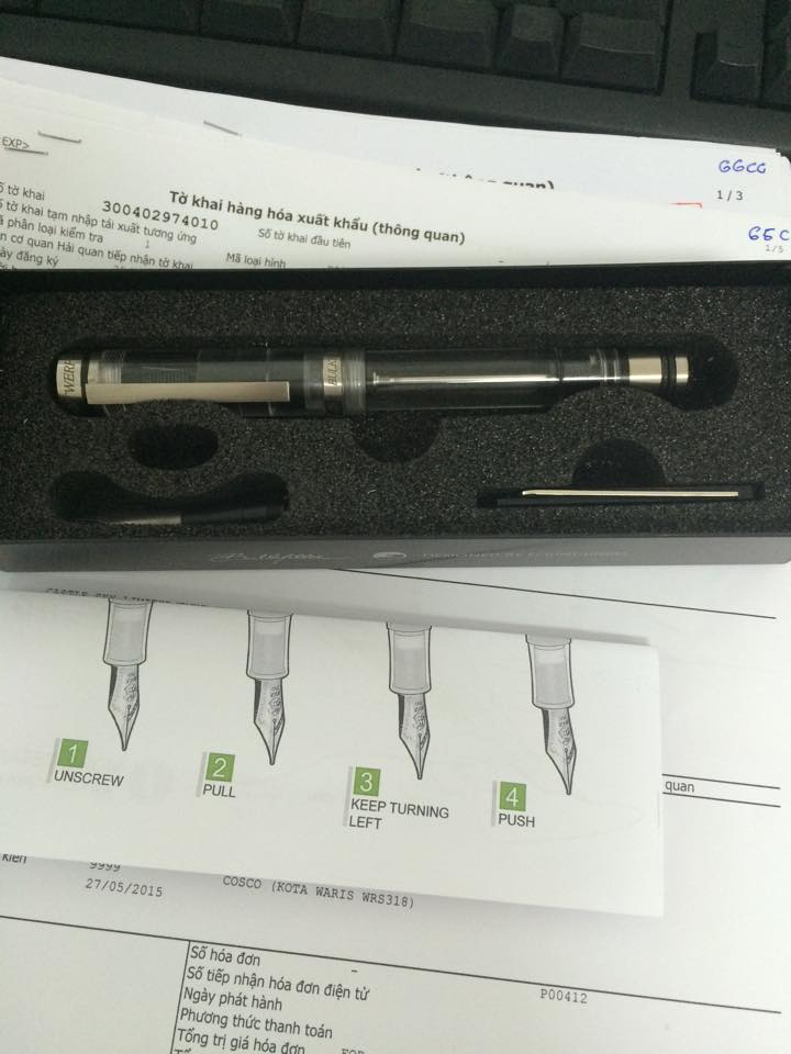 Bộ sản phẩm của em bao gồm : Bút , tool, và 4 ngòi ( 2 thép, 1 titan , 1 18kt )
