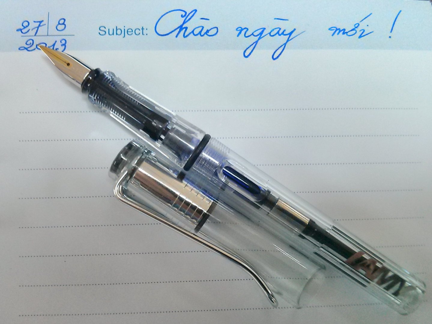 Mình đang tưởng tượng vào một buổi sáng đẹp trời trong một không gian tràn ngập ánh sáng tự nhiên, cầm em ấy trong suốt trên tay với màu mực Iroshizuku Ama-Iro óng ánh và mở nắp ra viết lên quyển sổ tay dòng chữ "Chào ngày mới", thật tuyệt vời ..Đó chỉ là ước mơ trong tương lai, hiện tại mình đang ve vuốt em Thiên thần Lamy Vista và cũng không hề ngần ngại viết lên 3 chữ "Chào ngày mới" ..