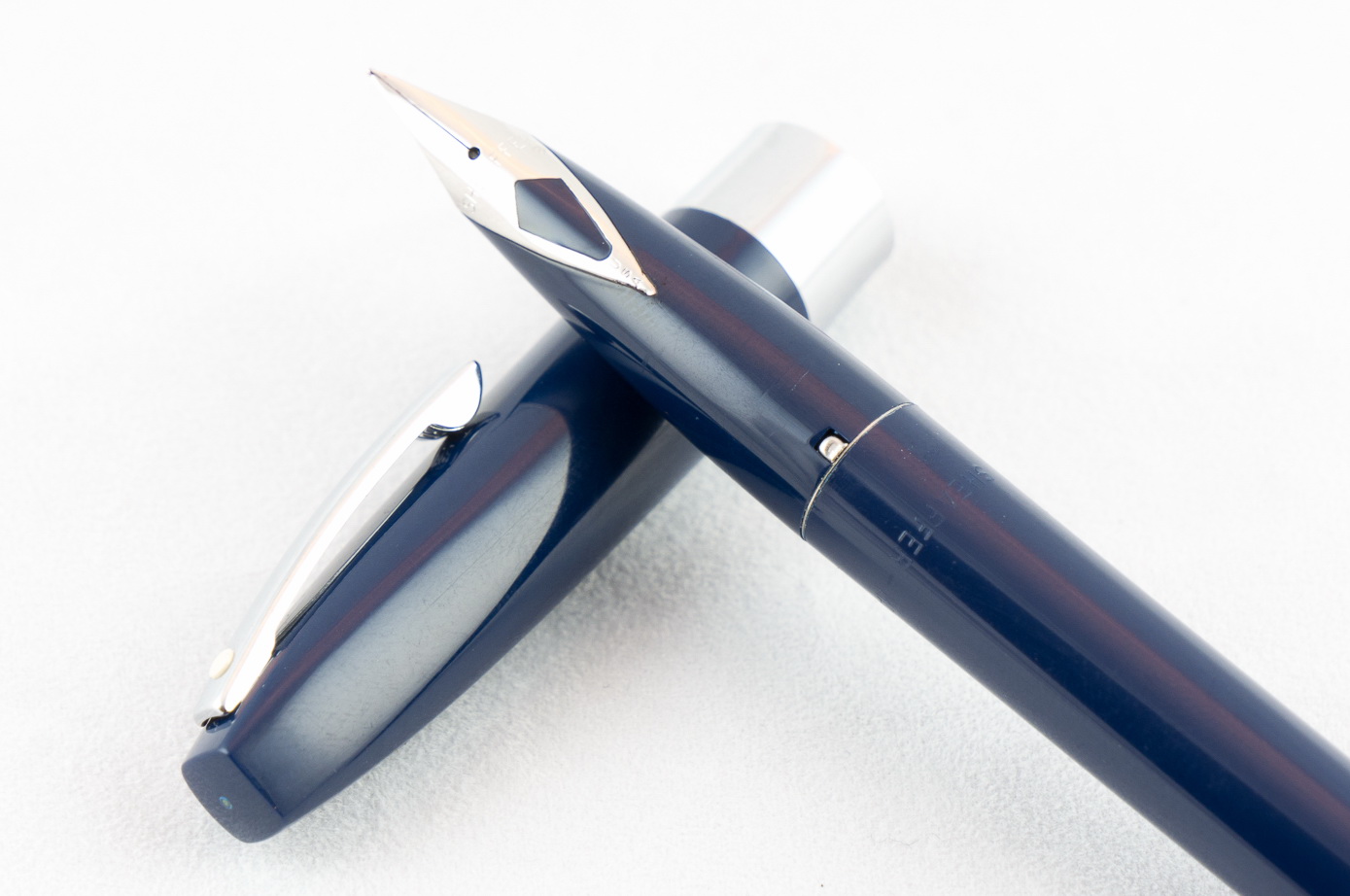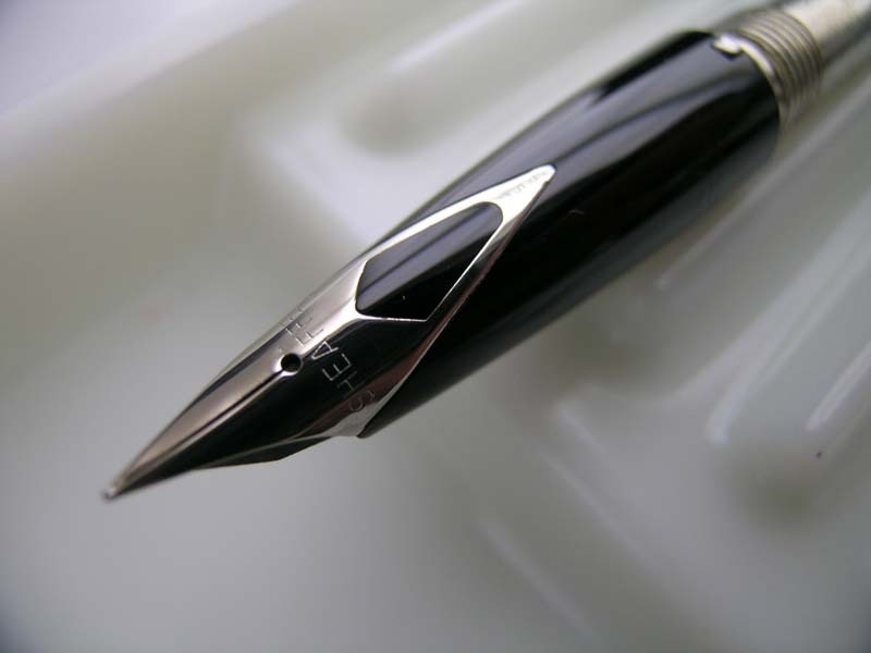 Nét độc đáo kế tiếp ( rất riêng ) cho ta nhận ra bút máy Sheaffer trong phân khúc này là cái ngòi hình mũi tên được ốp sát thân bút , đuôi ngòi như một mũi tên ngược xẻ đôi rồi hội tụ tại điểm cuối trên cái diện tích inox sáng bóng này được khắc chìm rất tinh xảo 3 chữ U S A . ( Tôi nghĩ mấy anh muốn làm hàng nhái sẽ bó tay chấm com ngay.