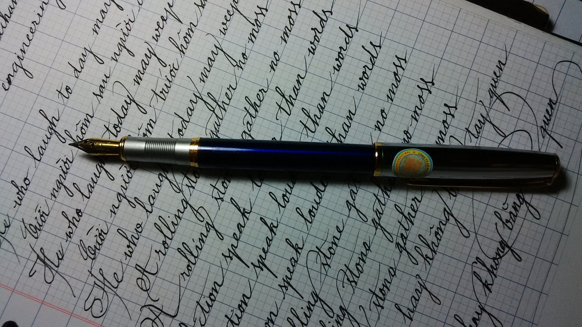Chắc không có gì nhiều để nói về cây Pilot để bàn này , em tóm gọn như sau : thân dài chừng gang tay ( khoảng 20 cm ) nhựa resin đen bóng , cầm đầm tay, phần tay cầm hợp tay người châu Á , xử dụng mực cartridge ( Muốn dùng converter thì mua riêng của nhà Pilot ) , một nắp nhựa trắng có làm gờ để khi bút nằm trên bàn viết sẽ không bị lăn , ngòi không ghi cỡ nhưng chắc là EF vì nét rất nhỏ , )