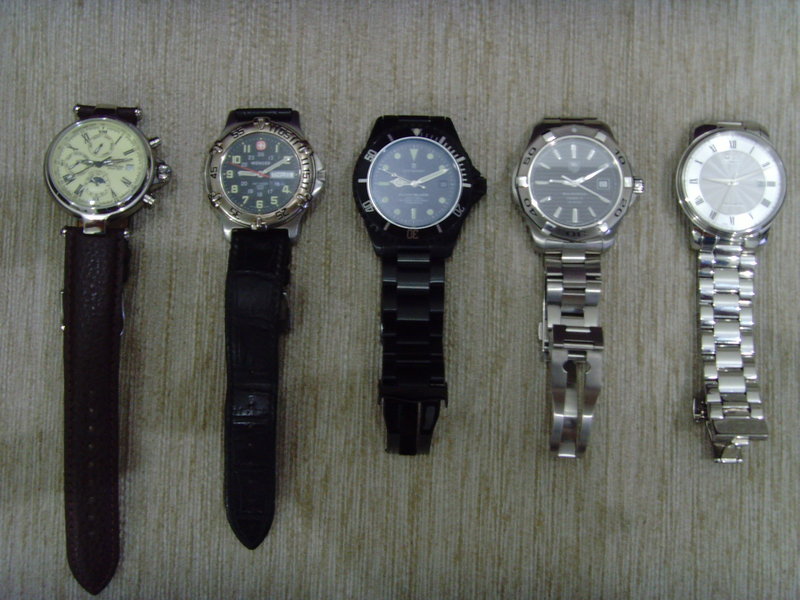 @ltl14: liệt kê theo thứ tự từ thấp đến cao: Steinhausen Complication Date (Swiss Design, China Movement and Case), Wenger Swiss Army (Swiss Quartz bền vô địch, gần 10 năm rồi vẫn chạy tốt, lume hơi mờ tí), Steinhart Black Ocean DLC, Tag Heuer Aquaracer Calibre 5 300m và cuối cùng là Mido Baroncelli II Chronometer top grade movement adjusted in 5 positions and temperature.Em ko identify đc 2 em ở 2 phía ngoài cùng. Em bên trái thì thiết kế nổi tiếng của VC, nhưng khả năng nhiều là ko phải vì ko thể nằm cạnh em Wenger thế kia đc. Em đoán bừa là Stauer
