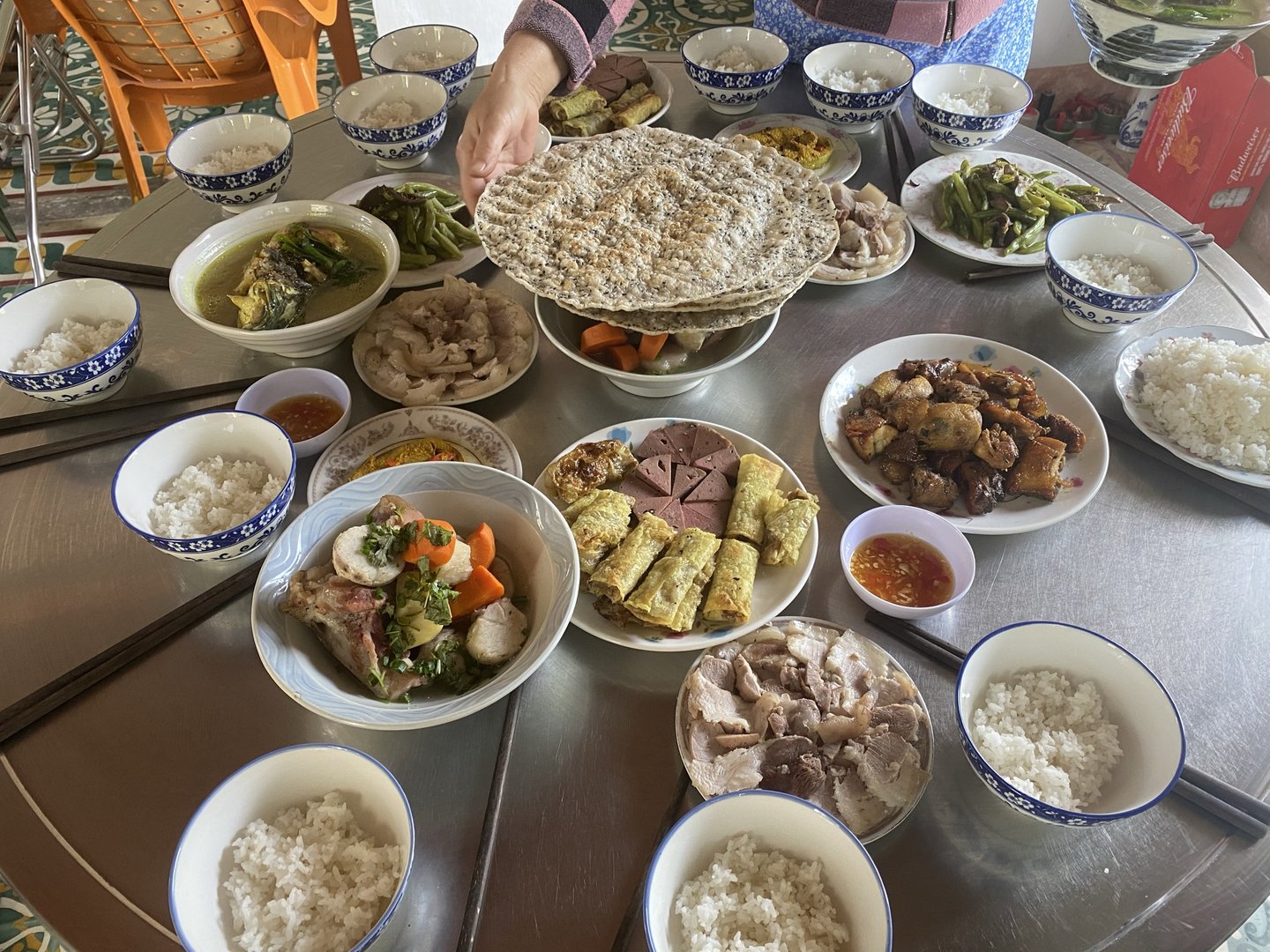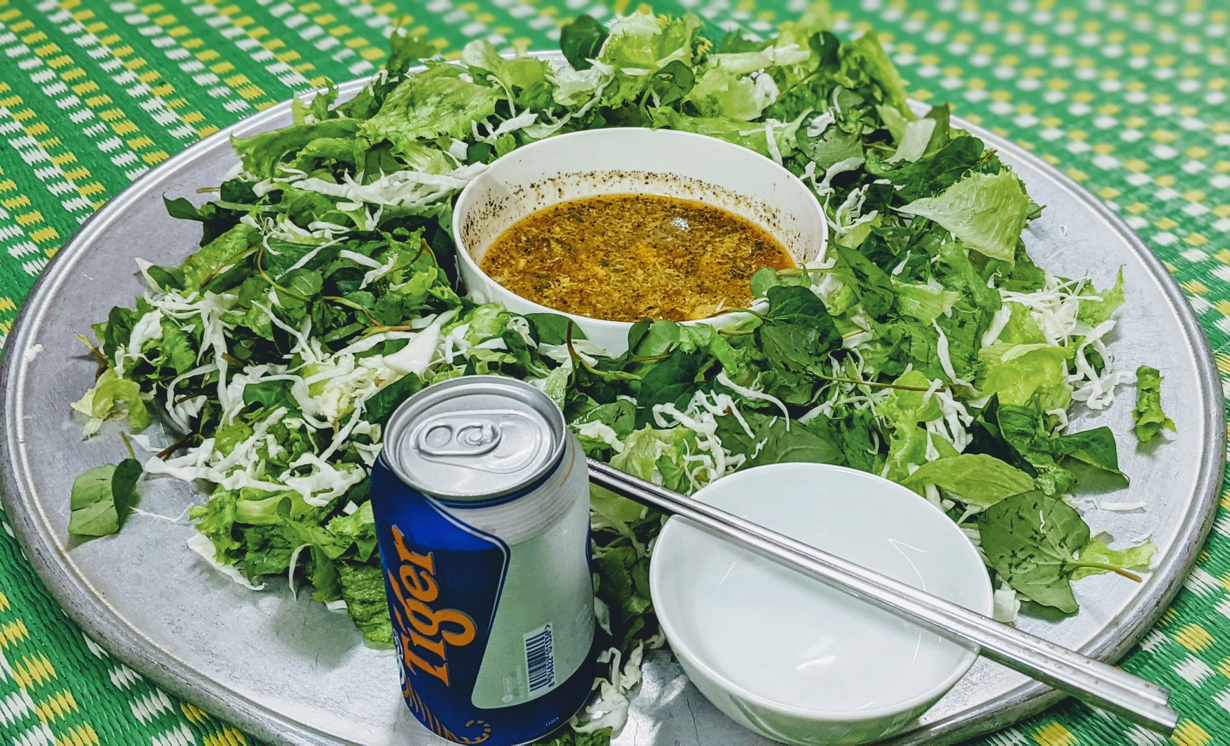 Rau nhà trồng cả thôi bác ah: xà lách còn, diếp cá, bắp cải và 1 ít rau thơm. Nước chấm được pha chế bằng: hành chăm (củ nén) phi dầu cà chua, hành lá, nước mắm và trứng gà, khi nêm nếm cho thêm ít tiêu bột, hạt nêm, bột ngọt tùy thích. Chấm ngập phê lòi bác ah chủ yếu bổ sung rau cho 1 tuần thịt cá ngán ngẩm