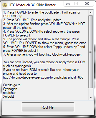 Sau nhiều ngày lang thang các trang mạng, tìm kiếm cách Root em HTC Mytouch 3G Slide từ các diễn đàn em cũng tìm ra được cách Root chỉ với 1 Click. Đã Root thành công. Có điều file tải về để Root có dung lượng khá bé (tầm 138Mb).