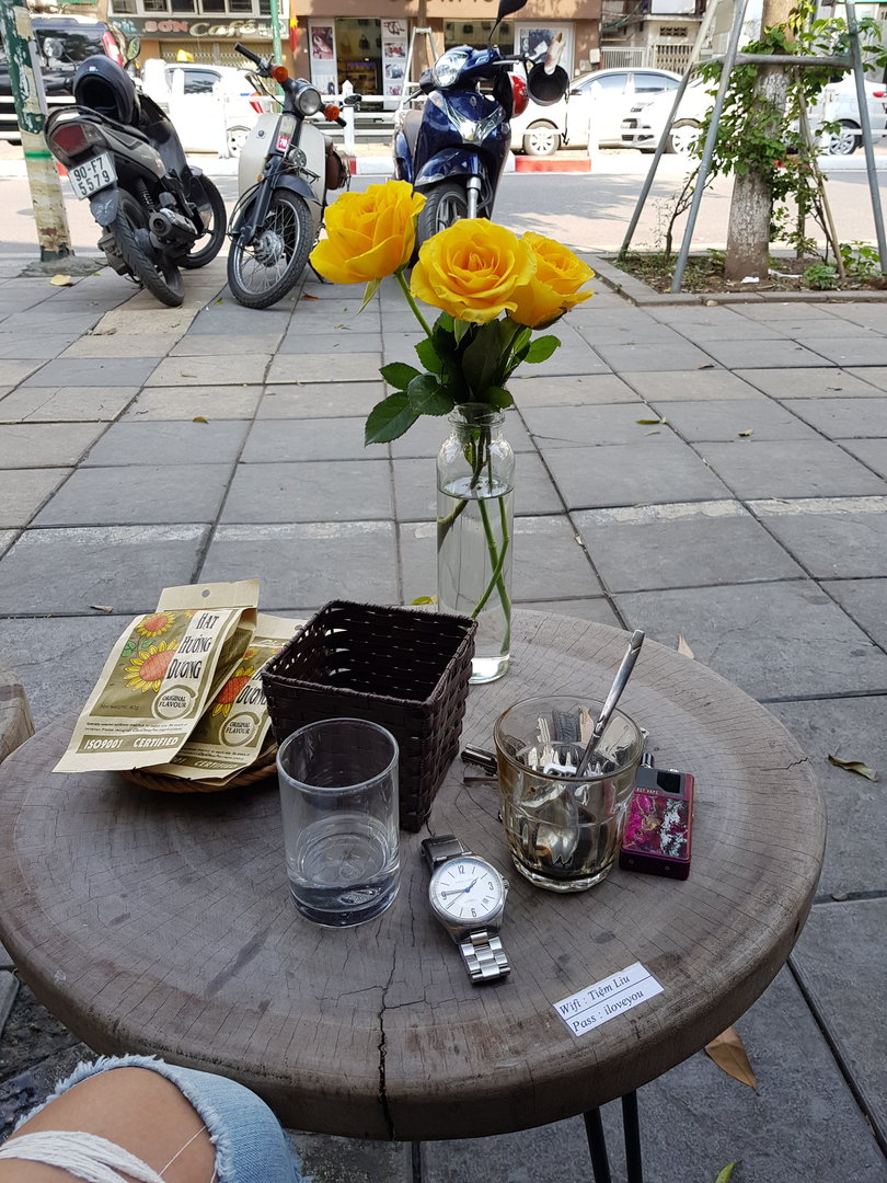 Chắc mới té xe, rách quần nên mới ngồi nghỉ cafe cho hoàn hồn đây mà!Em chỉ tranh thủ cf trưa