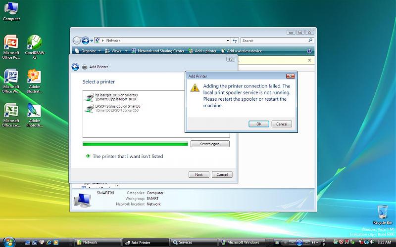 Công ty em dùng mạng nội bộ, toàn XP SP2, có chia sẻ 2 máy in là HP 1010 và Epson C63. Các máy XP chia sẻ và in ngon lành qua mạng. Nhưng không hiểu sao máy của em (cài Vista RC1) lại không làm cách nào add cái máy in mạng vào được. Nó toàn báo lỗi như sau (xem hình) Có bác nào biết giúp em với. Em đã thử dùng driver cài trực tiếp vào máy vẫn không được