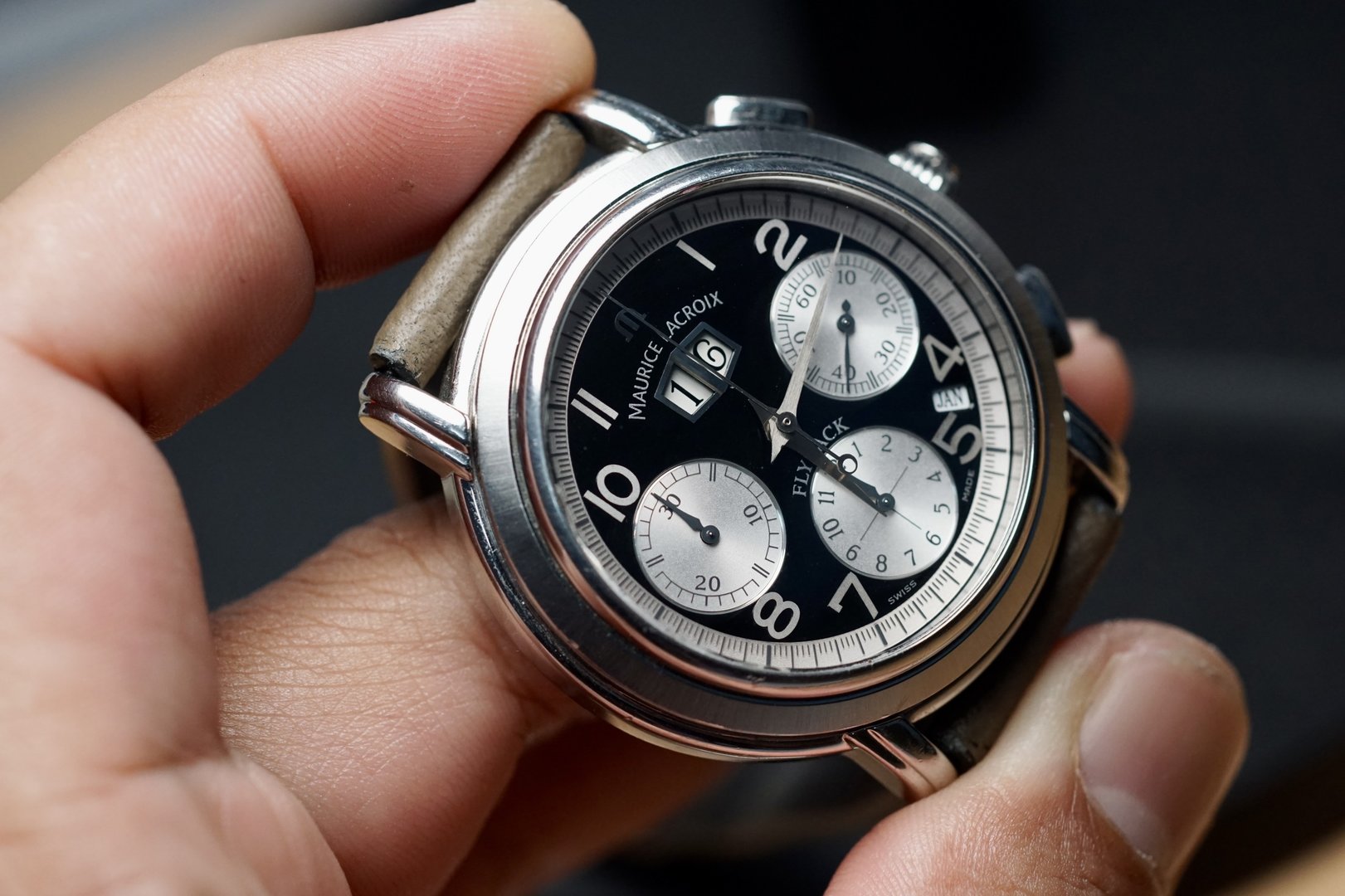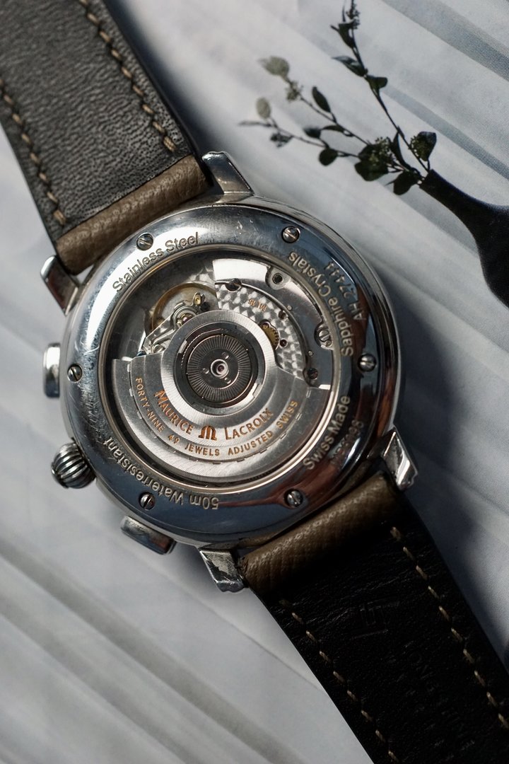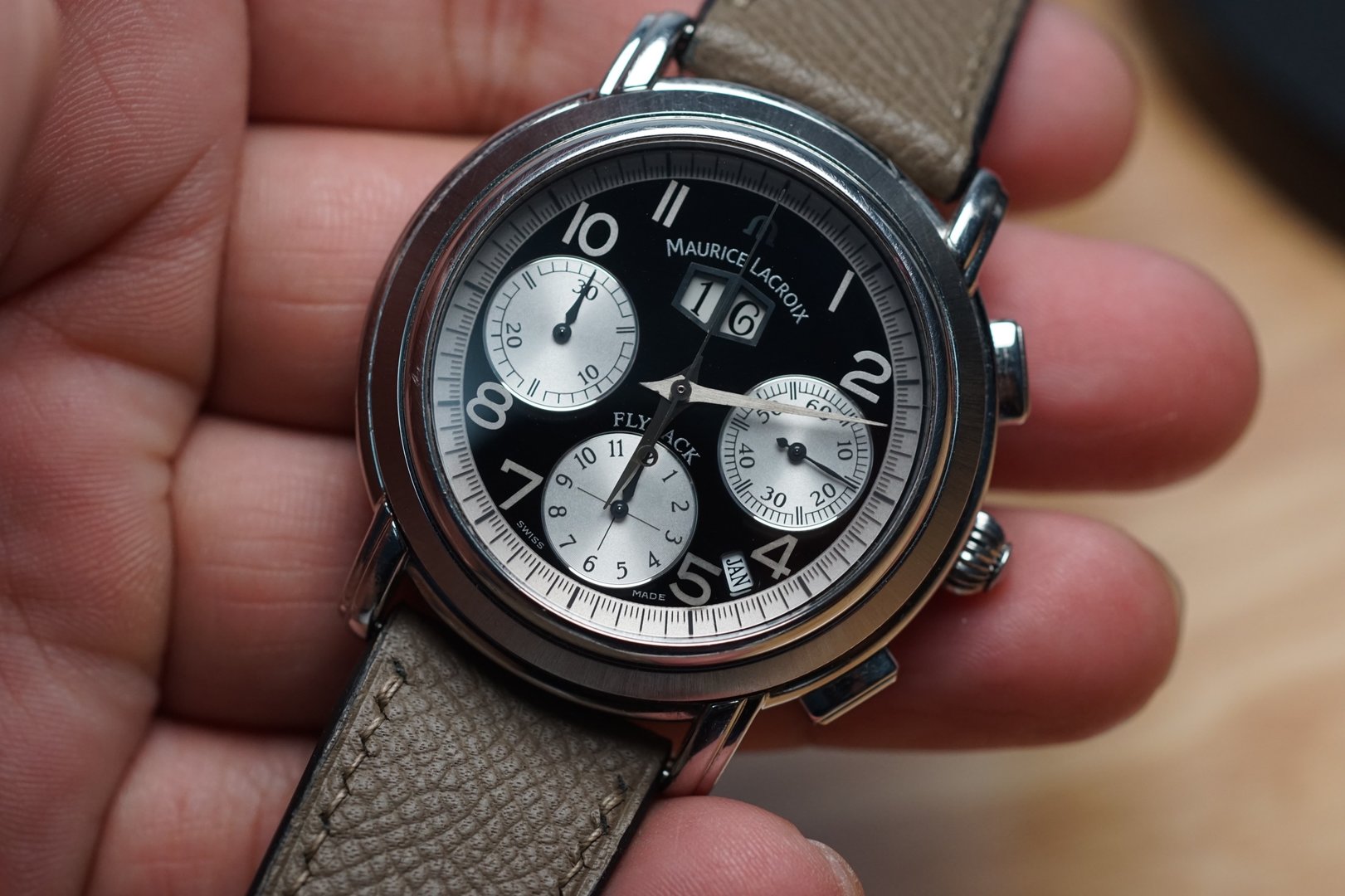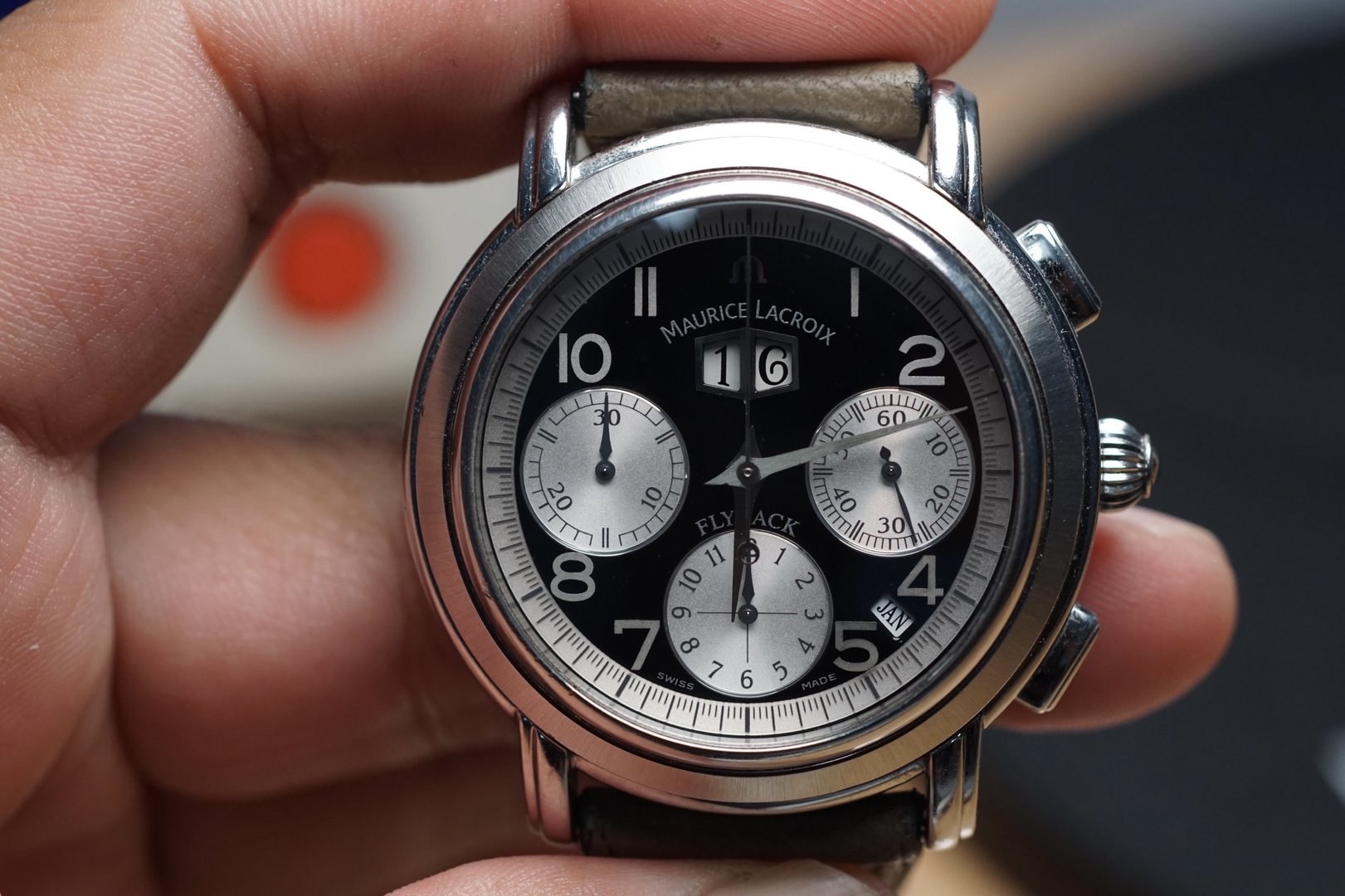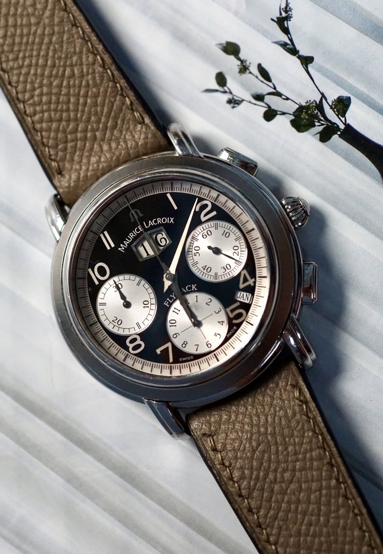 Cần bán em Maurice Lacroix Masterpiece Flyback MP6098 dial panda, máy chronograph automatic flyback calibre ML15 big date 2 chữ số riêng biệt và annual calendar (4 năm mới phải chỉnh lại 1 lần). Size 40mm, dày 13.8mm.