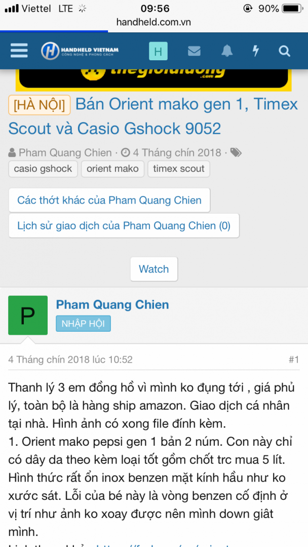 do thích em orient mako pepsi từ lâu. nên e có tích cóp được ít. thấy có bạn có nick pham quang chien đăng bán. giá 2 bên thoả thuận là 1.5t. e phi từ vĩnh phúc xuống cầu diễn để giao dịch. đến nơi đúng như topic của bạn ấy nói là vòng benzen k xoay đk. em ok k vấn đề. e hỏi vấn đề nước thì bạn ấy bảo thoải mái k vào. cách đây 1-2 hôm thì đồng hồ vào nước và vành benzen xoay được. em có liên lạc va bạn ấy nhưng k trả lời. lần đầu mua đồng hồ cơ mà thất vọng quá các bác ak. các bác có giao dịch vs bạn này chú ý nhé. e có đôi lời gửi tới bạn pham quang chien : mua bán có thế nào nói thế bạn ak.đừng che đậy như 1 thói quen.cái gì cũng sẽ có giá phải trả. e cũng có ít ảnh gửi các bác xem. cảm ơn các bác đọc bài. e lần đầu phản ánh. có gì lủng củng các bác thông cảm