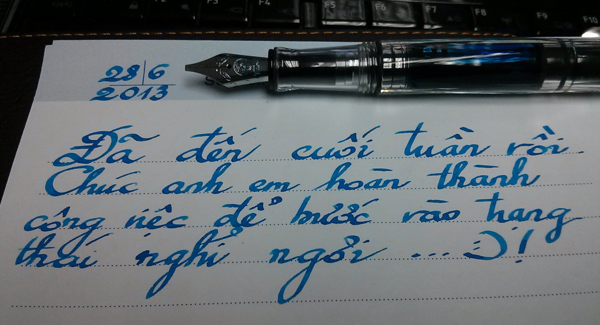 Màu mực đẹp quá!!! đây có phải màu xanh Agao của mực Iroshizuku không bác?Cả tuần nay mình bận rộn quá, hôm nay chuẩn bị cuối tuần mới thảnh thơi đôi chút nên dìu em TWSBI 540 viết vài dòng tâm sự cùng anh em ..