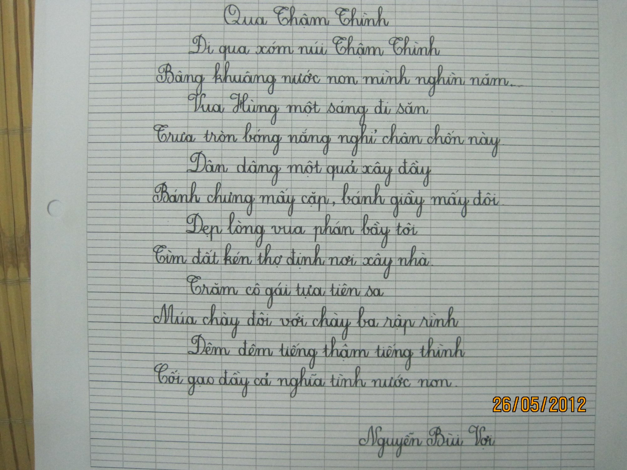 Chữ bác đẹp khiếp quá. Thấy chữ mình mà ngậm ngùiEm xin gửi vài hình ảnh chữ viết tay của con gái em khi con cấp 1 (giờ con đã 25 tuổi rồi). Cũng là thành viên luôn theo dõi cùng bố vào HHVN trước đây. Đây là 2 kiểu chữ con viết thẳng và viết nghiêng với bút mực trên nền giấy ô ly học sinh. Chữ viết năm 2012 và 2014.