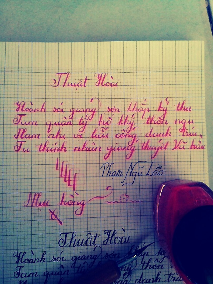 e bắt đầu tập viết lại :D bắt đầu mê chữ của mấy bác trong đây... bữa nay xin mấy bác cho e tham gia với.... tính e thích màu mè :D mà khổ cái là sv nghèo các bác ạ :confused: nên đành tự chế mực mà xài thành ra e chỉ dùng đc viết chấm mực:(