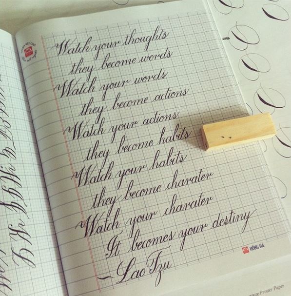 Do luyện tập là thành đấy bác @hanghn ơi. Nếu bác yêu thích nó, muốn chinh phục nó thì không có gì khó cả, nói chứ đây là kiểu chữ dễ nhất trong các kiểu chữ, những kiểu khác còn khó hơn nhiều. Chủ yếu do mình có muốn tập không chứ như em đây 1 năm trước có mơ cũng không dám nghĩ mình viết được vậy ^^