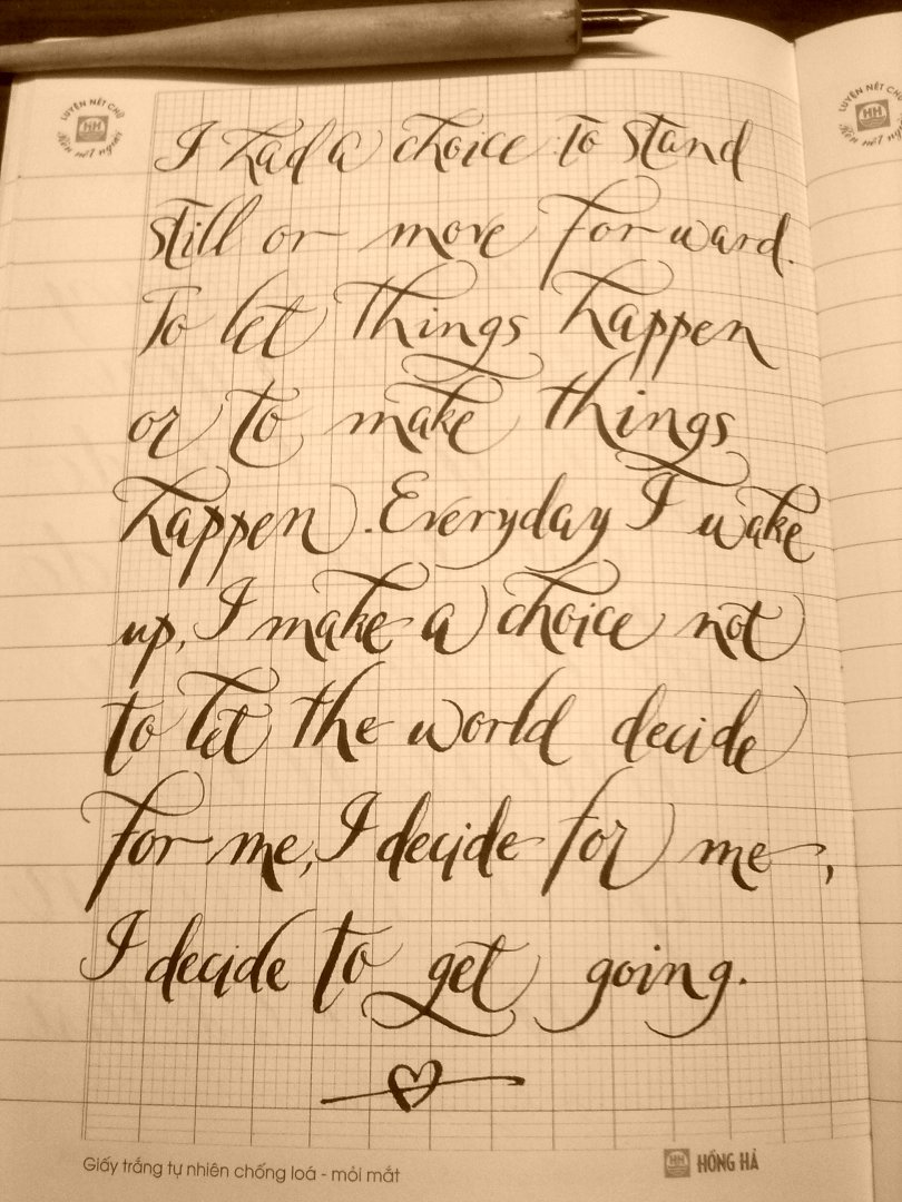 Thật ra thì em đã có tập nhưng thời gian em không ổn định nên chưa sắp xếp tập hàng ngày được. Mà cái kiểu ngoáy kia thì vài ngày không tập thì đâu lại vào đấy. Đến nay em vẫn chưa làm được cái "sử dụng vai" nữa.Bằng tầm này là xong cursive nếu bác bắt tay vào luyện từ tháng 4 đấy, nếu còn than nữa chắc em tập sang cái khác rồi mà bác vẫn chỉ ..........như chưa bắt đầu