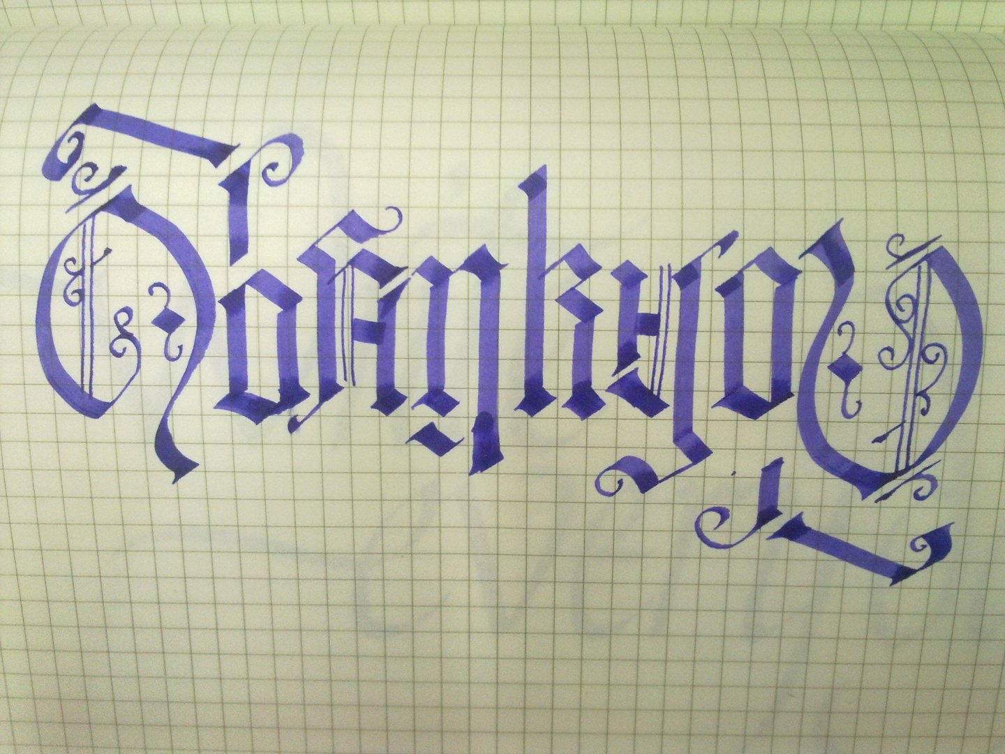 Em xin cảm ơn những lời bác @borntoshine đã khen tặng, nhưng trước khi vào diễn đàn này em không hề có khái niệm gì về chữ Latinh cả, nhờ bác @inpluviam khai sáng với bài viết: Cách luyện viết chữ đẹp mà em bắt đầu viết. Sau 12 tháng em đã tập đủ từ Cursive, italic, gocthic, fraktur... và 1 số dòng khác. Và cách đây 2 tháng em mới tập dip-pen. Em nói những điều đó để nói 1 điều là: em - rất bình thường- đã tập được, bác chắc chắn còn tập tốt hơn em. Em đã hướng dẫn có bác tập chỉ 2 tháng ( trong khi với Cursive em tập 6 tháng ), bác có thể thấy em không nói sai bằng cách xem những bài em viết trên này.chữ Gothic của bác ongnon đã lên chiếu sư rồi, em mượn lời khen của bác nào trên diễn đàn từng khen.