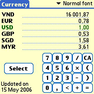 Currency convert có thể tính toán tỷ giá giữa nhiều ngoại tệ, giống như chức năng currency của worldmate, nhưng có điều là nó hoàn toàn free. Các bác có thể cài thêm conduit để nó tự động cập nhật tỷ giá mỗi lần hotsync, hoặc nếu không thì các bác manual download file cập nhật từ web của nó cũng được