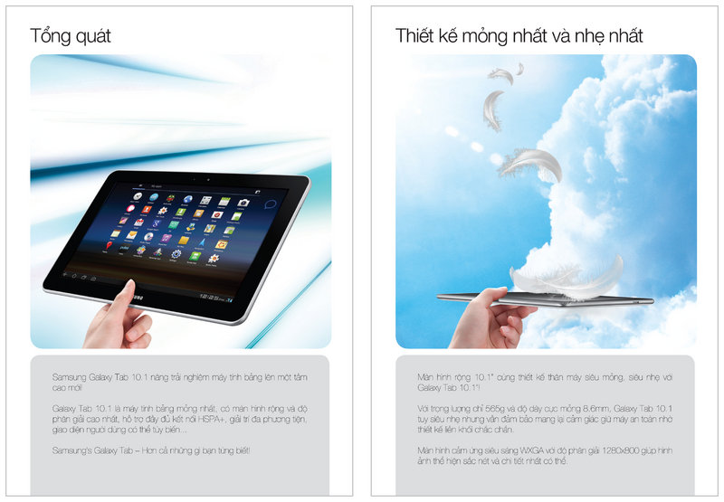 Câu slogan của Samsung tại buổi gặp gỡ là “Theo bạn 8,8mm đã đủ mỏng chưa?”. Ông Vi Quốc Hùng, giám đốc sản phẩm điện thoại thông minh và máy tính bảng của hãng tại Việt Nam tự hào tuyên bố Galaxy Tab là máy tính bảng mỏng nhất (8,6mm) và nhẹ nhất (0,565kg).