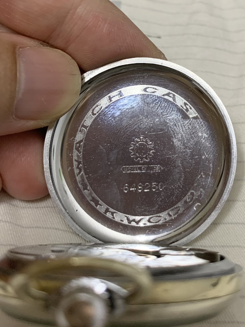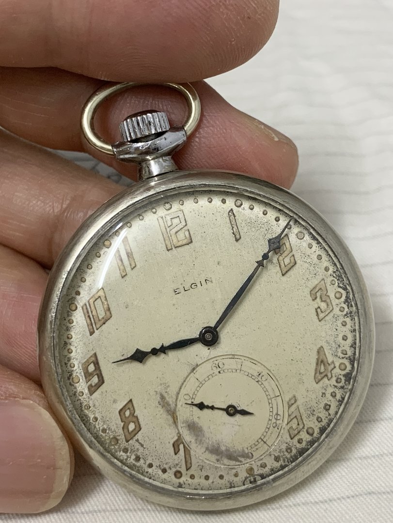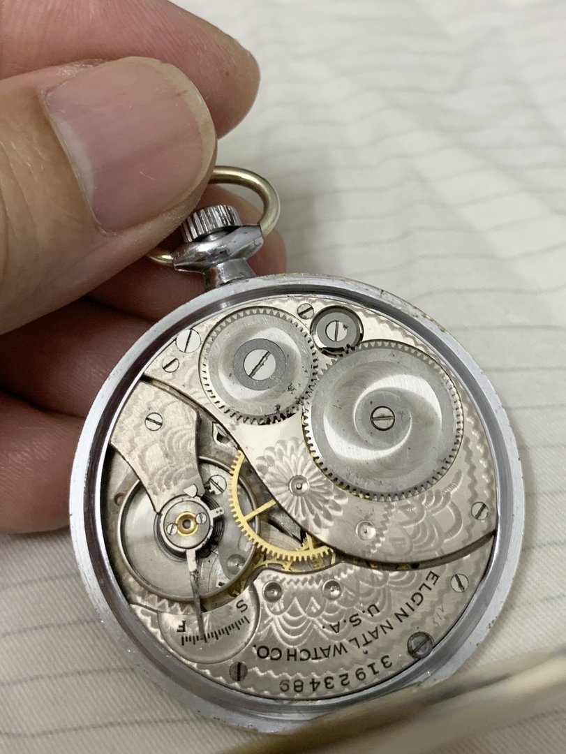 Đồng hồ quýt Elgin, made in USA, size tròn 43mm, máy săm trổ full bóng đẹp phê pha, dial có bộ kim bằng thép nung xanh tuyệt đẹp, cọc số nổi nhiều vết thời gian