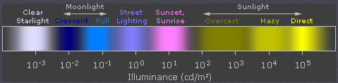 Đo chính xác cường độ ánh sáng, hoặc độ sáng (luminance), là khá quan trọng để đánh giá khoảng Dynamic Range. Ở đây chúng ta sử dụng thuật ngữ illuminance - chiếu sáng - để chỉ ánh sáng tới. Cả hai ánh sáng illuminance và cường độ độ được đo bằng đơn vị cd/m2 (candelas per square). Giá trị gần đúng của các nguồn sáng được hiển thị trên hình dưới đây.