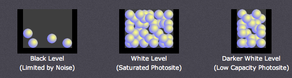 Mỗi khoang có thể xem như là một thùng chứa các photon giống như xô chứa nước vậy. Do đó, nếu xô chứa quá nhiều nước sẽ bị tràn. Khi khoang đã tràn thì được gọi là bão hoà (saturated), và do đó không thể phân biệt được khi nhận thêm các photon - đây cũng là cách để máy ảnh định nghĩa mức trắng. Với máy ảnh, tỉ lệ tương phản sẽ được định nghĩa là là số photo tối đa được chứa trong mỗi khoang chia cho cường độ sáng thấp nhất (1 photon). Nếu mỗi khoang chứa tối đa 1000 photon thì tỉ lệ độ tương phản là 1000:1. Do đó khi khoang lớn hơn, chứa được nhiều photon hơn, khoảng Dynamic Range cũng lớn hơn. Máy ảnh DSLR có tỉ lệ độ tương phản lớn hơn máy ảnh compact, do kích thước của mỗi điểm ảnh lớn hơn.