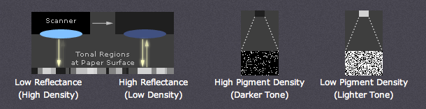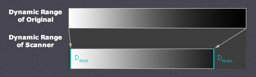 Máy scan sử dụng một đơn vị khác, đối với các vật có cùng độ bão hoà như trên máy ảnh số, thì khoảng Dynamic Range được mô tả bởi mật độ (D-Density). Điều này rất hữu ích vì khái niệm này tương tự như cách sắc tố tạo ra tông màu trên các phương tiện in ấn như hình dưới đây.