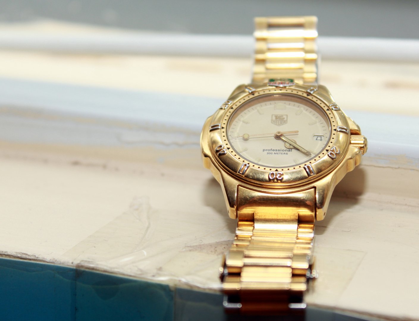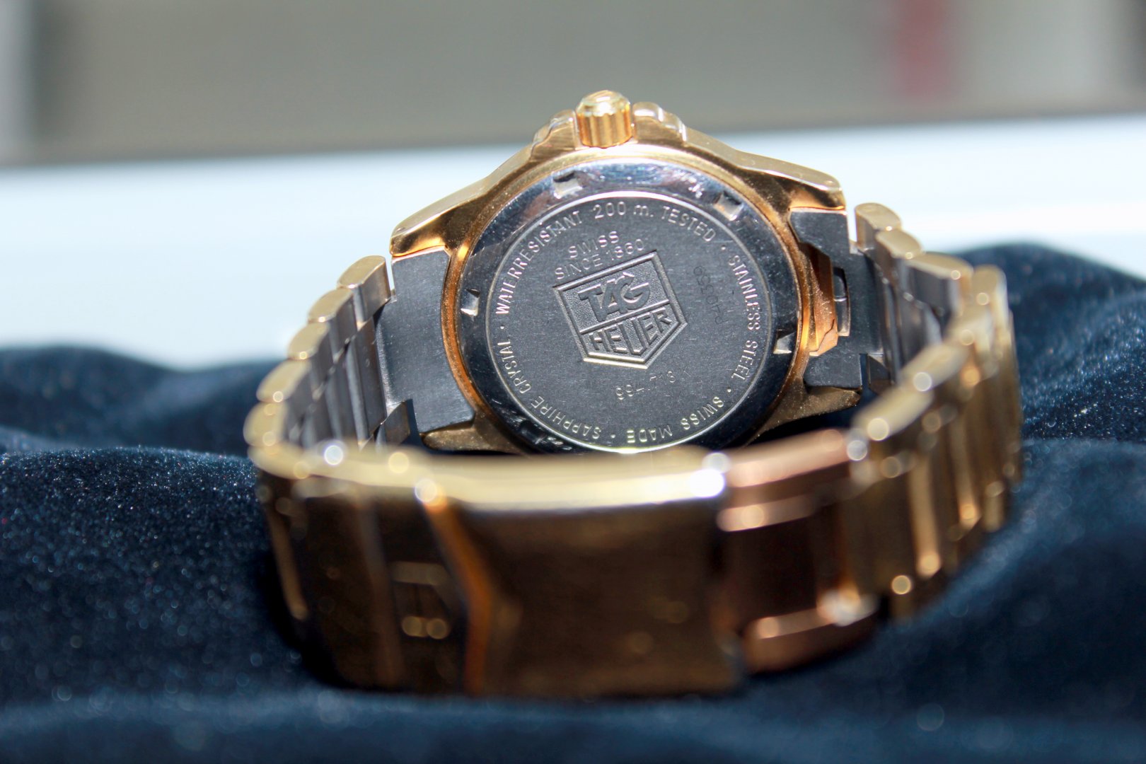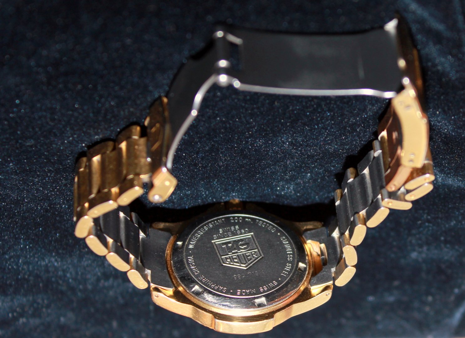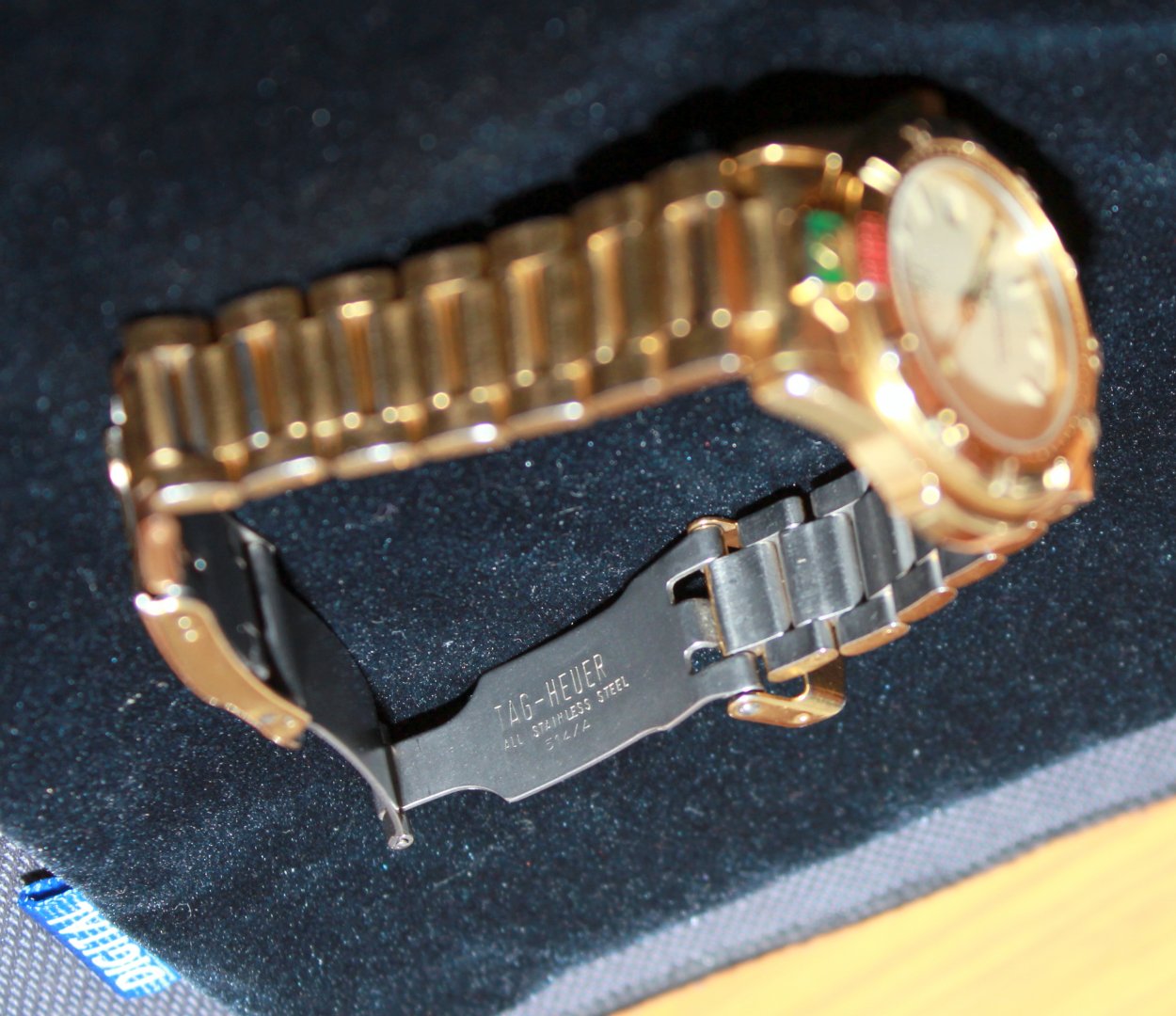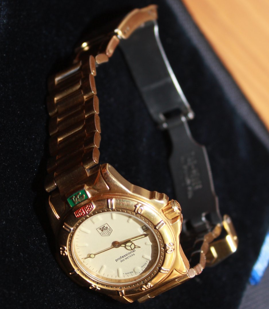 Đồng hồ em nó giống y xì bạn Tây này đã chụp và đưa hình lên. Nhưng chiếc của em nó mới hơn của bạn này nhiều lắm. Kiểu dáng và tất cả thì giống hệt ạ. Mạ mầu vàng còn rất chất. Đồng hồ có niềng xoay được (diver bezel) giống Rolex Submariner, Chất liệu vỏ stainless steel (inox hoặc thép không rỉ); Máy Quartz nguyên zin Tag Heuer chạy chính xác, kín nước, kính của nó là kính sapphire, có kiêru nút zin xiết vào vỏ giống như Rolex.
