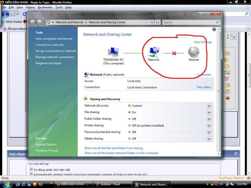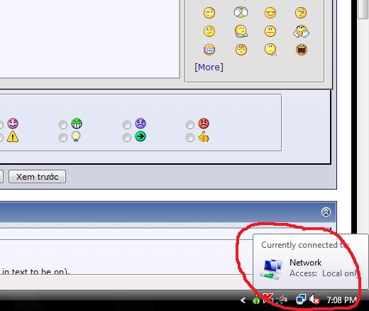 Máy e là Toshiba, xài vista home pre, mọi lần cái icon mạng ở góc phải bên dưới vẫn hiện lên mỗi khi connect = wiless, trong cty e vẫn dùng để connect internet + mạng nội bộ cty, hôm wa tự dưng cái icon này bị gạch chéo, trong khi e vẫn vào internnet bình thường, vẫn con nect mang wiless cty đc, nhưng lại o vô đc mạng nội bộ cty, loay hoay mãi o đc, ông IT thì biến mất, bực quá nhờ bác nài có kinh nghiệm chỉ giúp, thaxxx