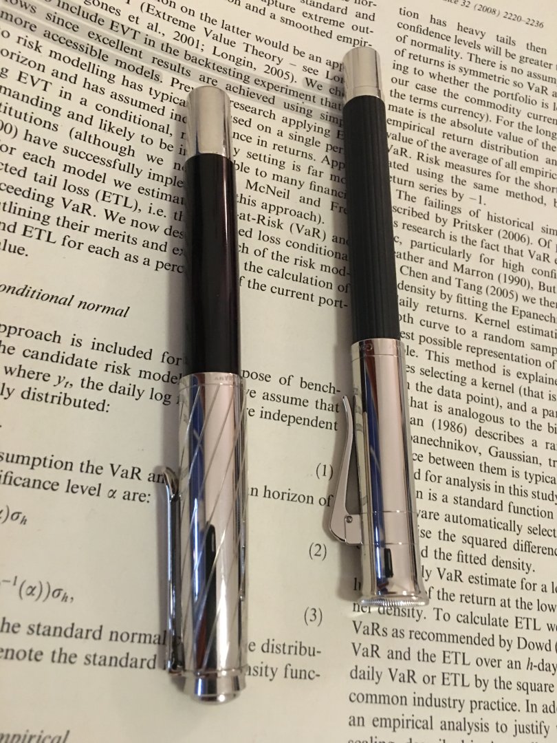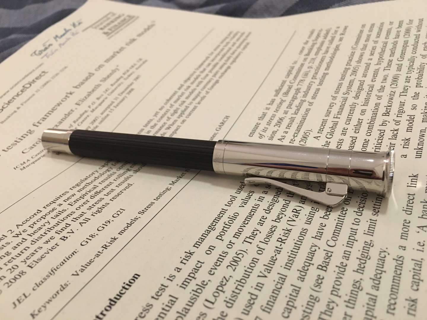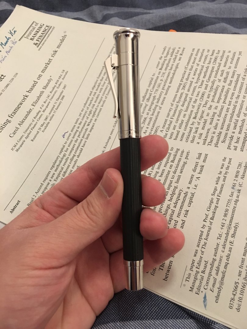 1 cây Graf von FB Classic Ebony wood. Màu đen tuy nhìn ko rõ chất gỗ như cây Pernambuco hay Grenadilla, nhưng được cái ko bám bẩn và nhìn rất ton-sour-ton với phần kim loại tráng bạch kim của bút. Phải công nhận build quality của Graf von FC Classic rất tốt, bút cầm đầm tay và chắc chắn, khớp vặn cuối rất chắc, ko bị lỏng như của Pelikan. Hy vọng mai kia kiếm được cây GvFC Classic in Sterling Silver, em cũng đang mê mẩn dòng này như bác chủ topic.