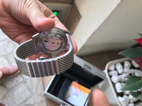 em nhờ dịch vụ ship bản silver dial và dây thì chọn dây mes gần 900 eur nhưng sau 5 tuần về trên tay thì có mấy điểm làm em rất băn khoăn thứ 1 là dây mes ngắn cụt lủn tay em 17 mà k đeo vừa mà tự nhiên lại có 1 mắt thừa ra ở đó em hỏi thì dc trả lời la hãng tháo sẵn nhưng ngay cả cho cái mắt đấy vào thì tay em sẽ vẫn k vừa chả lẽ vứt đi rất vô lí trước em cũng mua mấy em swiss thì dây kim loại đi kem lúc nao cũng rất dài phai cát 5,6 mắt mới vừa chứ k ngắn như vậy được, thứ 2 là cái búa rô to lại ko giống trong web như hình chụp em rất lăn tăn mong mn có ai giống th của em ko giả đáp hộ em ngóng từng ngay ma h về cảm thấy cực hụt hẫng