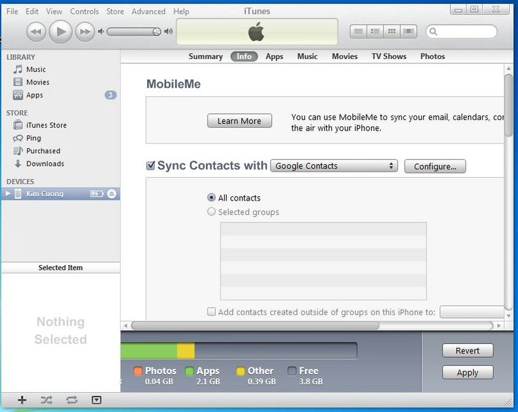 Kết nối iPhone với máy tính và bật iTunes lên, vào iPhone chọn Info và đánh dấu Sync Contacts With => chọn account tương ứng bạn đang có rồi ấn Switch, đăng nhập với User và Pass của account đó rồi ấn Apply 1 cái là xong.