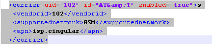<carrier uid="102" id="AT&amp;T" enabled="true">s