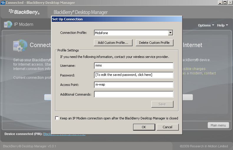 Bật Blackberry Desktop Manager và kết nối lại, nút ẩn sẽ được hiển thị. Kế tiếp là tạo một profile theo các thông số nhà mạng > Save lại và tiến hành kết nối sử dụng bình thường.