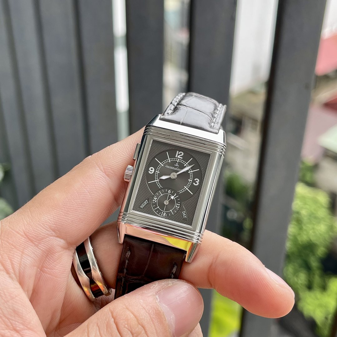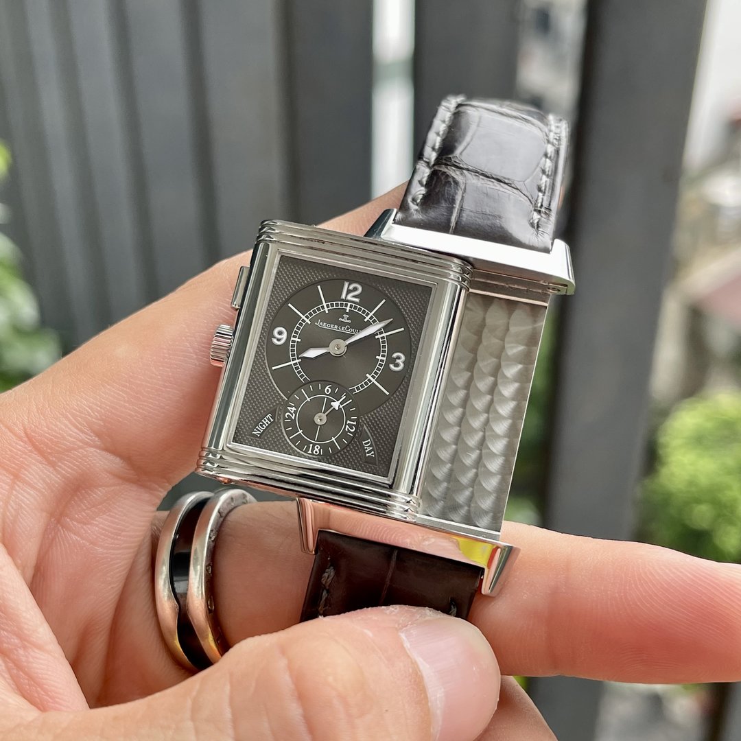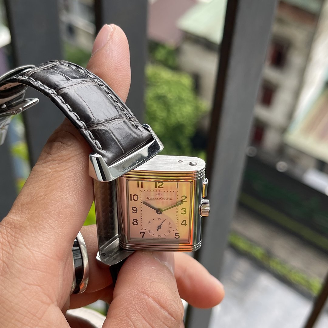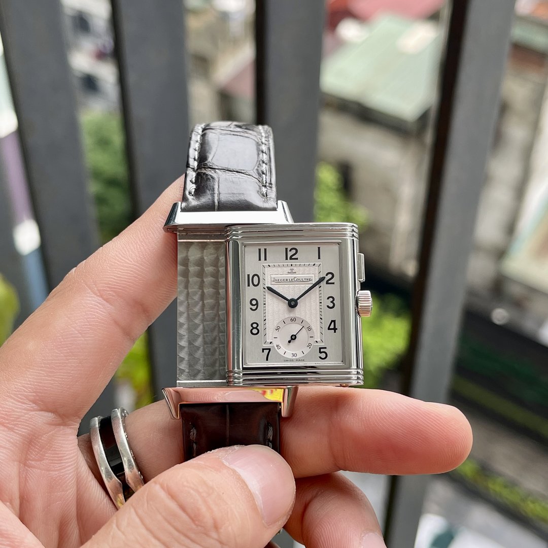Đồng hồ với 2 mặt số hiển thị 2 múi giờ độc lập và cơ chế lật mặt rất độc đáo, size 26x42mm khoảng 38mm tròn sử dụng bộ máy lên dây inhouse jlc 854/1 tích cót 45h. Đồng hồ đã qua sử dụng xước dăm không cấn móp chỉ còn đh và thẻ date 2017. Bảo hành 2 năm.