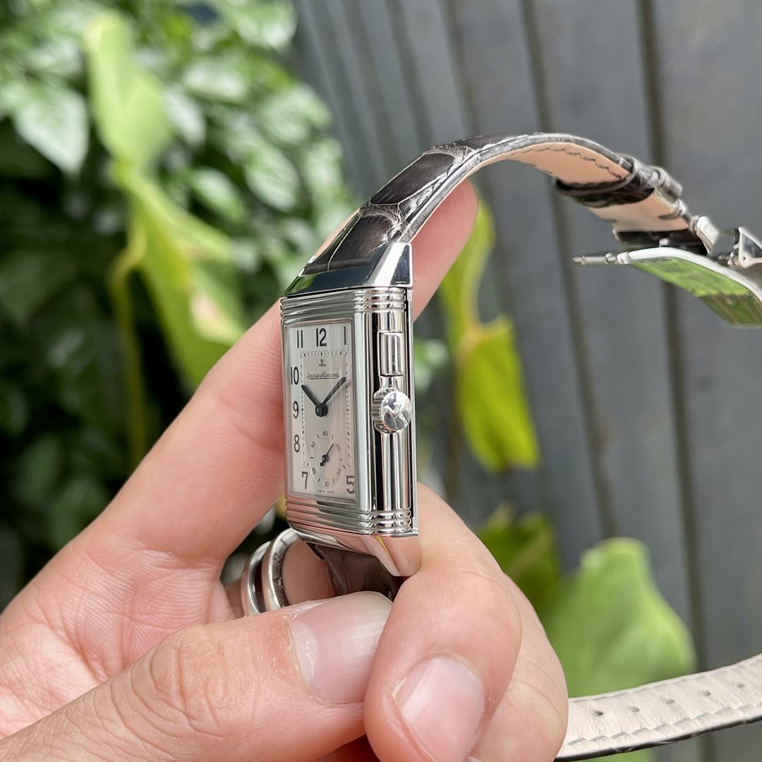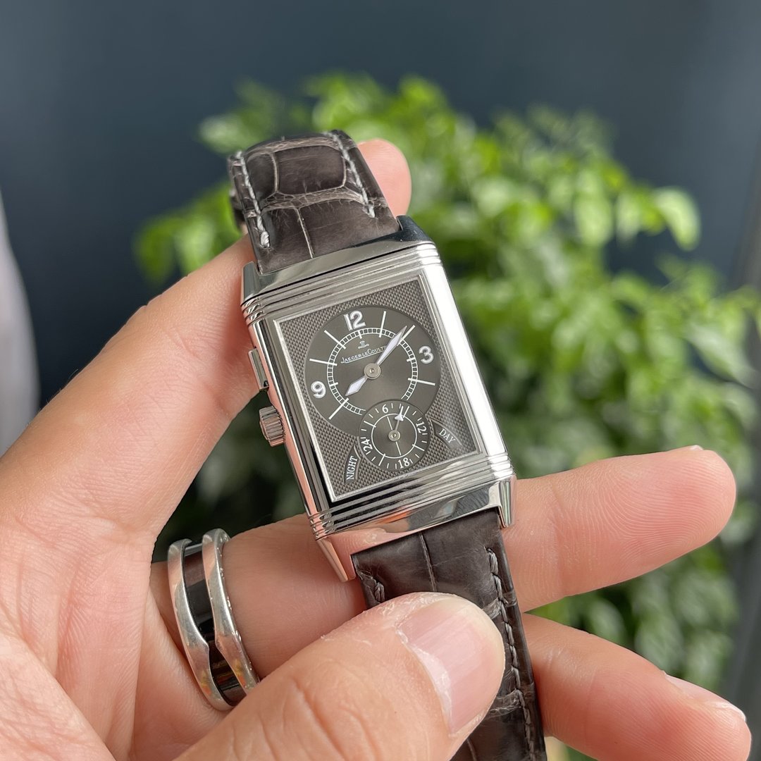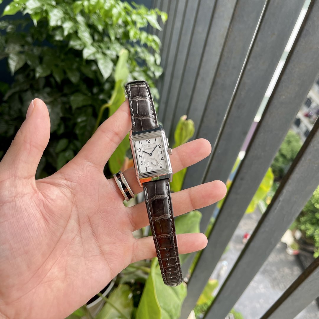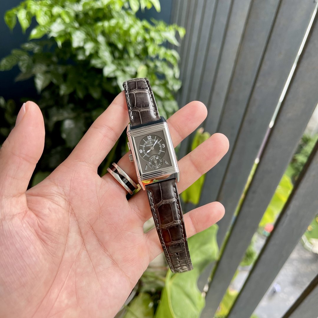 Đồng hồ với 2 mặt số hiển thị 2 múi giờ độc lập và cơ chế lật mặt rất độc đáo, size 26x42mm khoảng 38mm tròn sử dụng bộ máy lên dây inhouse jlc 854/1 tích cót 45h. Đồng hồ đã qua sử dụng xước dăm không cấn móp chỉ còn đh và thẻ date 2017. Bảo hành 2 năm.