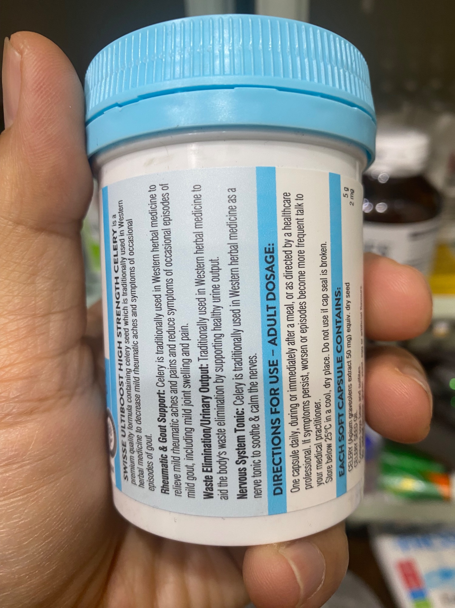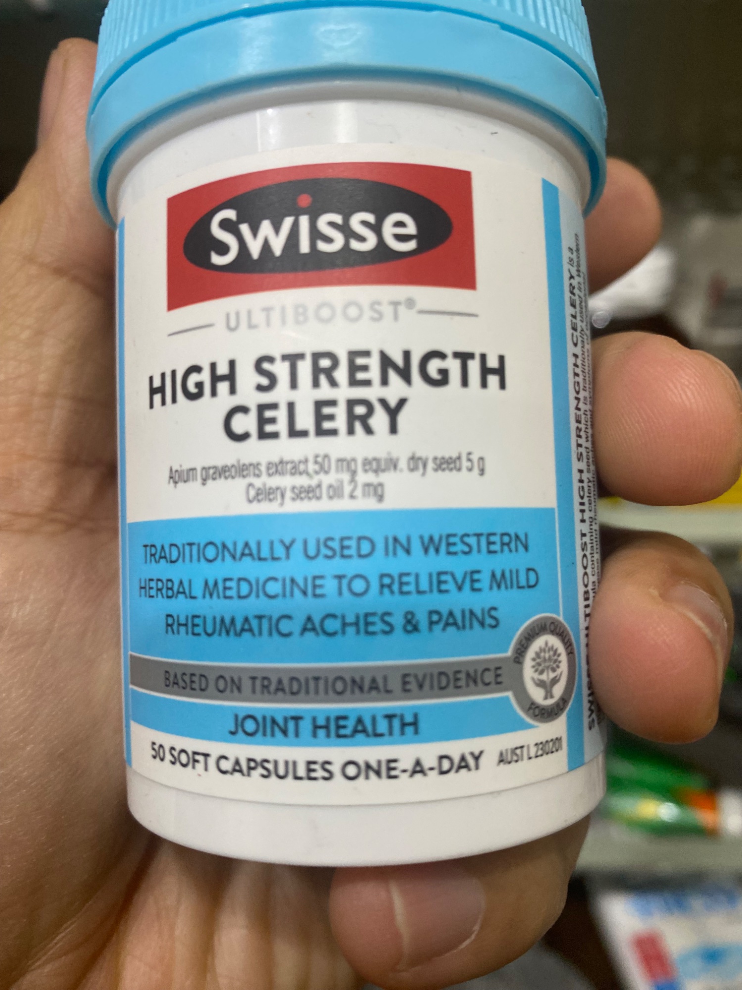 Swisse Ultiboost High Strength Celery 50 Capsules là sản phẩm bổ sung chất lượng cao từ thương hiệu Swisse của Úc, được thiết kế để hỗ trợ sức khỏe khớp và giảm các triệu chứng liên quan đến viêm khớp nhẹ và gout. Mỗi viên nang chứa chiết xuất từ hạt cần tây tương đương với 5g hạt cần tây khô, một thành phần được sử dụng truyền thống trong y học thảo dược phương Tây để giảm đau và viêm khớp nhẹ.