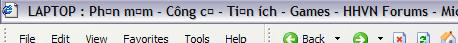 Các bác thử nhìn lên cái thanh ngang trên cùng của IE xem có hiện thị được tiếng việt không nhé. E chụp cái này các bác xem file đính kèm thử xem ("Phần mềm - công cụ - Tiện ích..." không hiện thị được tiếng việt!)