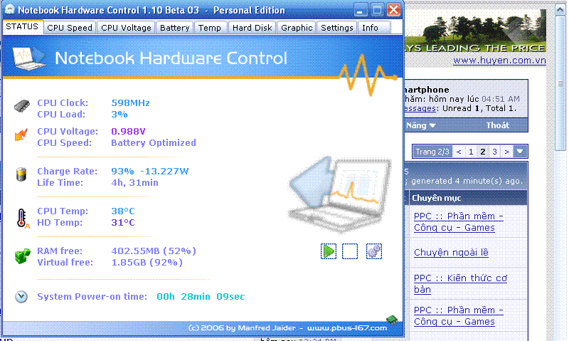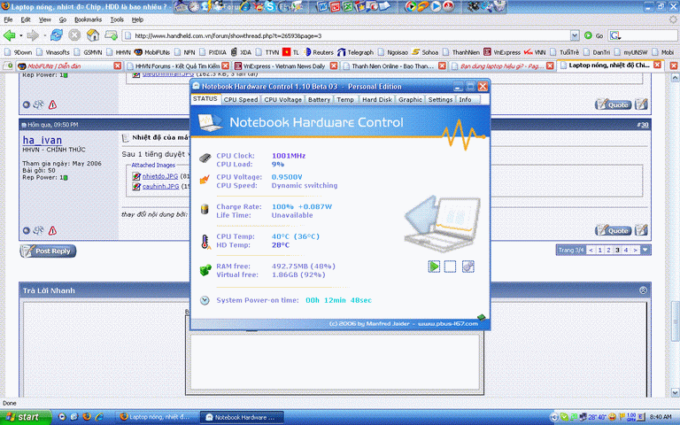 ha_ivan nói:Em tưởng là chỉ có con Acer của em mới bị nóng thôi chứ,thì ra cũng có nhiều bác chịu chung số phận với mình.Nhưng hiện tại em đã khắc phục được rồi,bằng cách chạy chương trình epower của Acer và để chế độ enable fan , máy chạy mát rượi , để thêm đế tản nhiệt nữa thì mát cứ y như lúc tắt máy. Theo em nghĩ là mỗi brand máy đều có 1 chương trình để kích hoạt fan, download chương trình đấy về và để chế độ enable fan thì mát sẽ mát ra rất nhiều .
