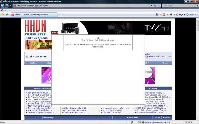 Cứ mỗi lần mở HHVN forum ra (IE8) thì lại bị cái vote (đã vote rồi phang vào mặt, tìm mãi mới kéo nó xuống khỏi cái banner của zing search mà close nó đi, các bác edit lại đi :^o